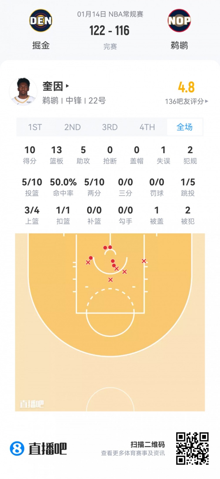 鹈鹕首轮13号秀奎因登场28.8分钟