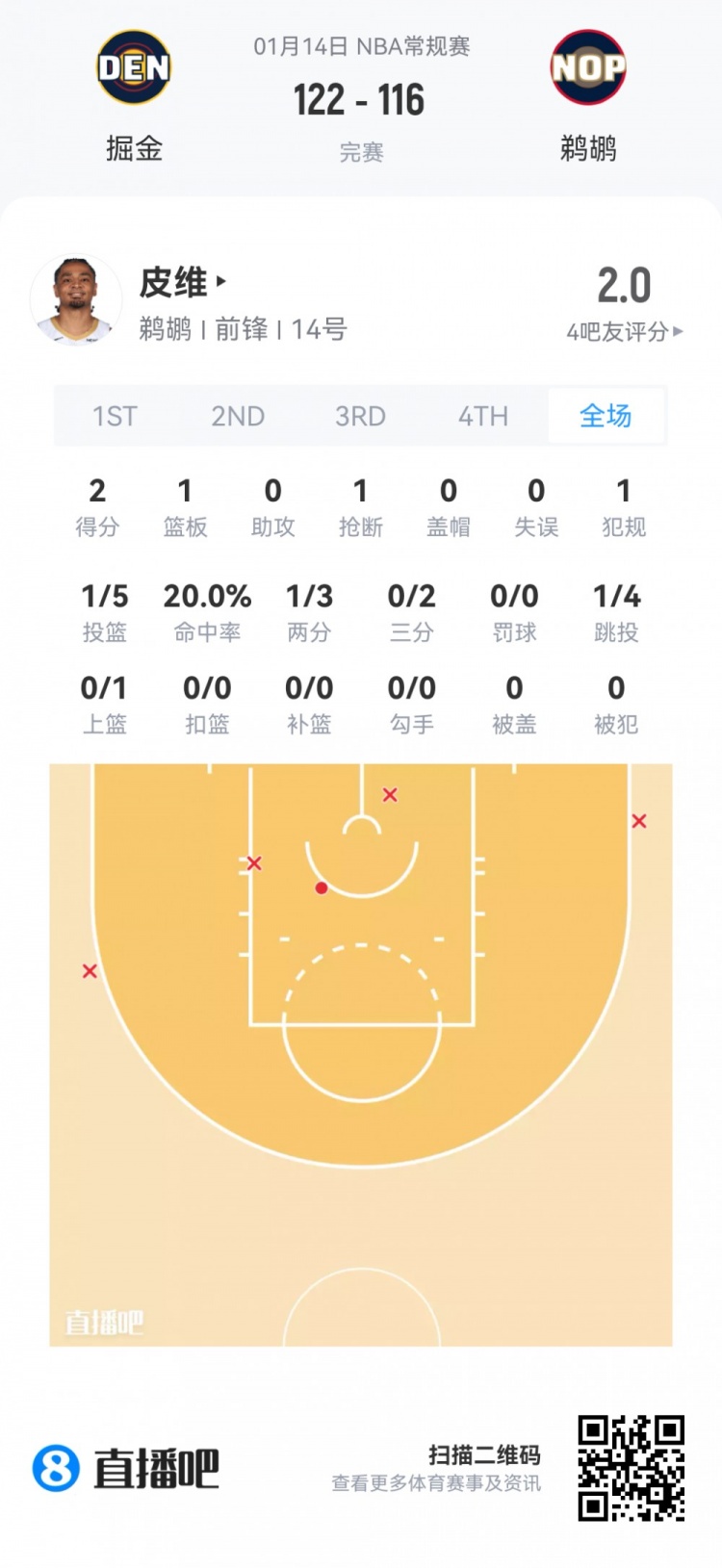 鹈鹕次轮40号秀皮维登场11.9分钟