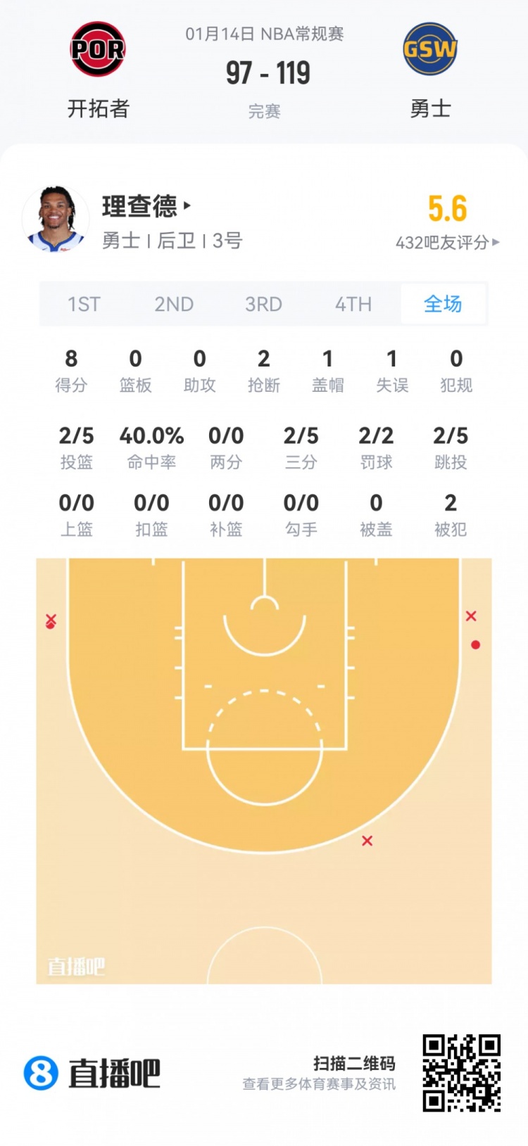 勇士次轮56号秀威尔·理查德登场18.5分钟