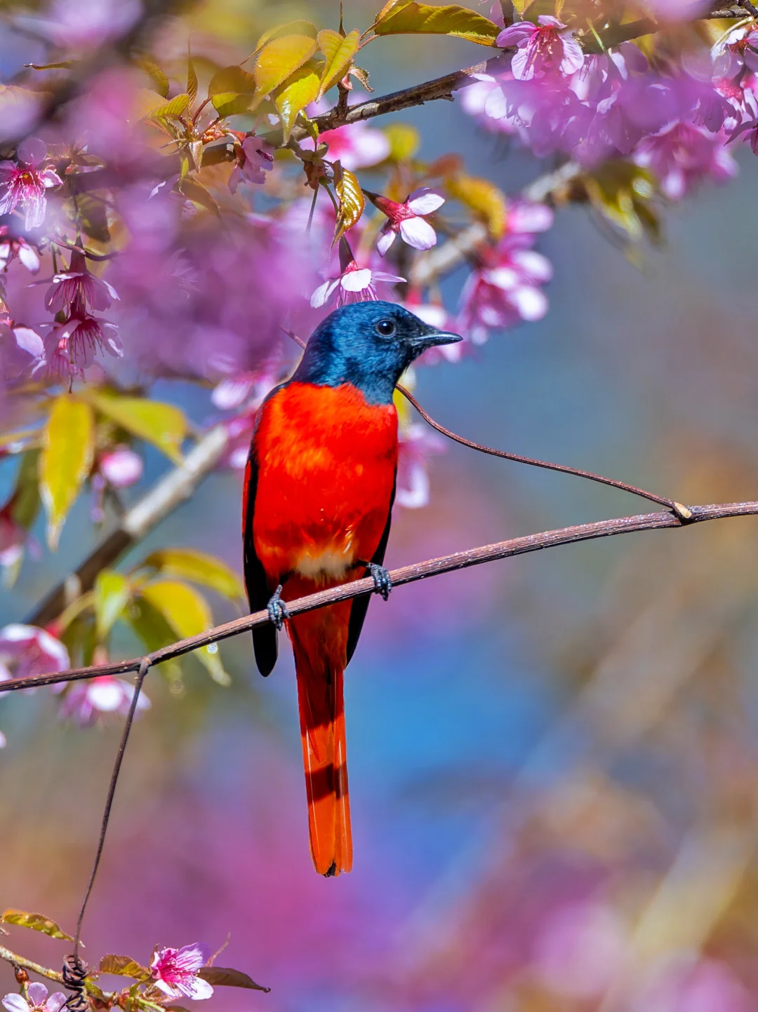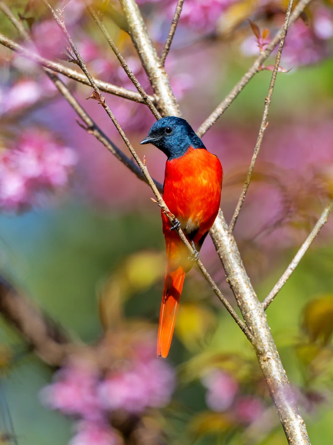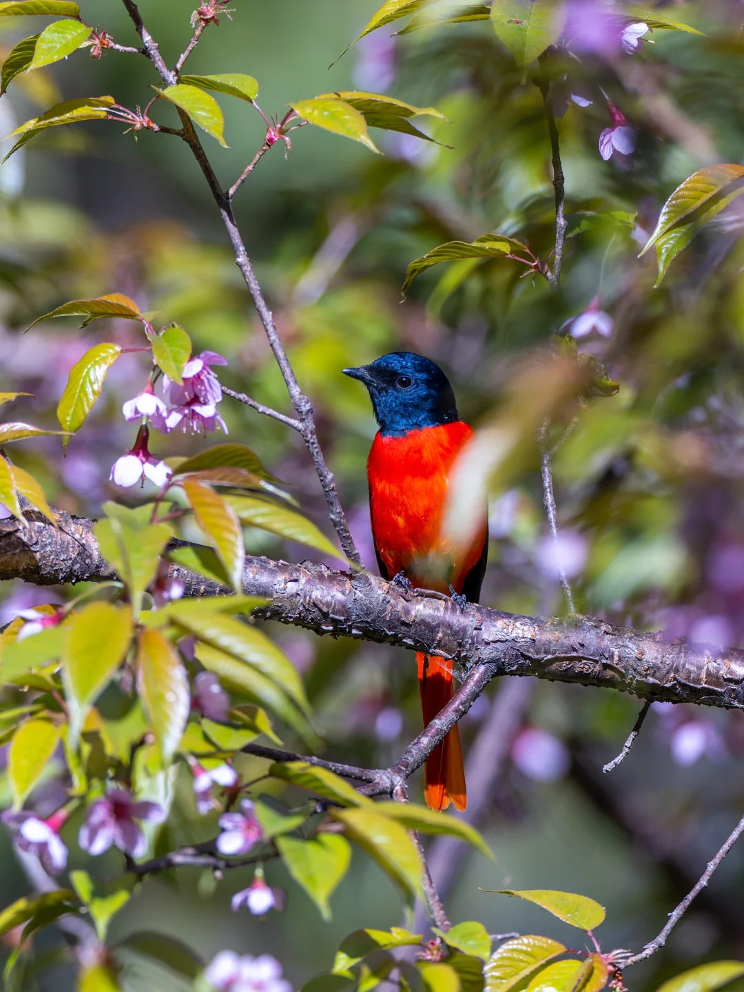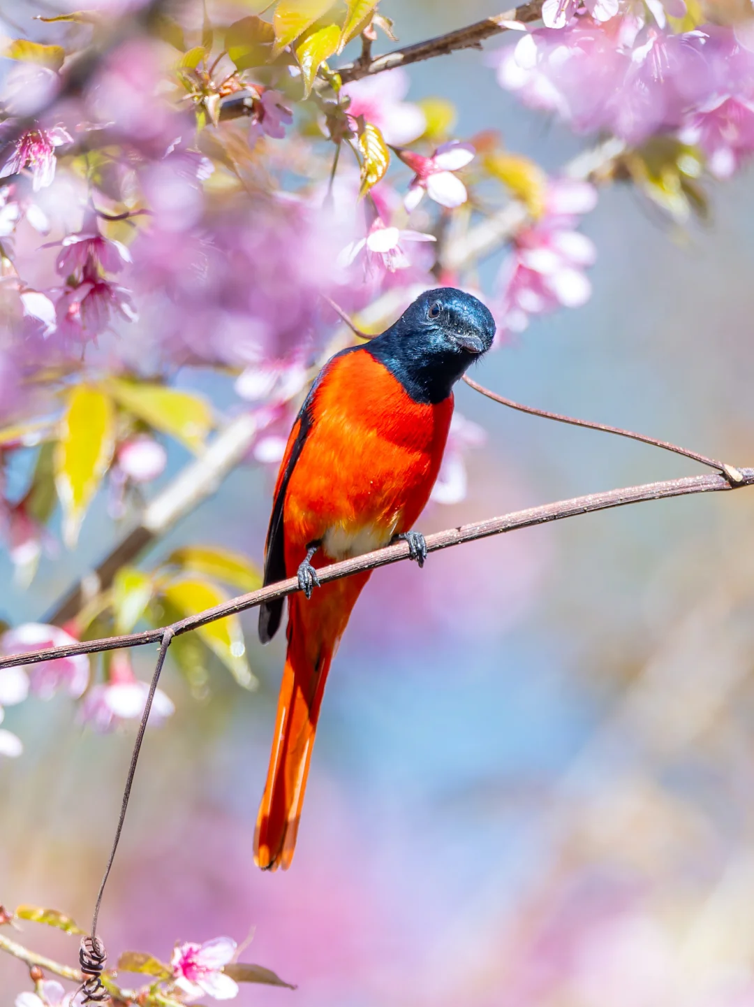 原创拍摄于2026.01 短嘴山椒鸟,Short-billed Minivet,雀形目鹃鵙科山椒鸟属。分布于喜马拉雅山脉至我国的西南地区。 短嘴山椒鸟也是有着艳丽的羽色,雄鸟是醒目的红黑配色,雌鸟灰黄相间。它们的体型较小,特别是嘴较短小,和同样黑色喉咙的赤红和长尾相比,翼斑是L形。雌鸟的额头到头顶是黄色的。 短嘴山椒鸟是不常见的留鸟。没想到这次能看到在云南樱花下穿梭跳动的短嘴山椒鸟,有一种属于春天的浪漫。
