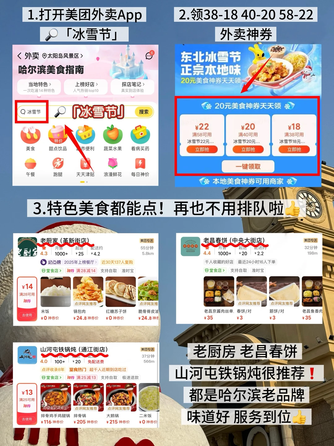 而且现在来东北玩的宝子 打开美团外卖App 🔎「冰雪季」 可以领取38-18 40-20 58-22优惠券 特色美食都能用 超划算❗️像老厨房锅包肉 老昌春饼墙裂推荐‼️