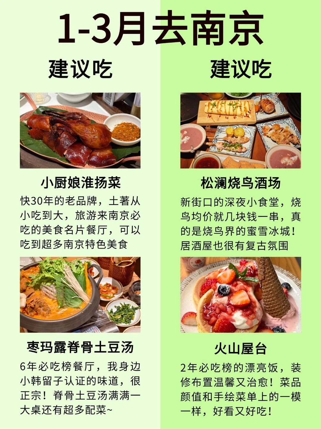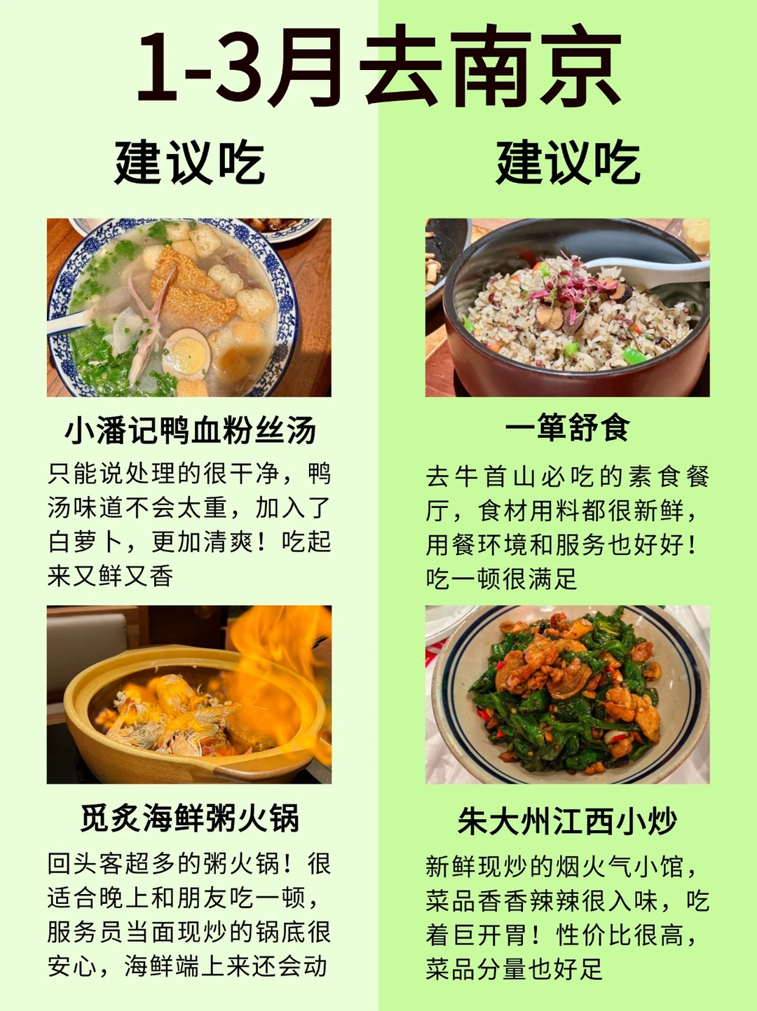 1-3月的南京真的很好玩,如果是雪天还有机会看到超美的景色!✨ 整理了这份超全攻略,包含了很多经典,从特色美食到景点注意事项,一次性讲透! ✅必去景点 早上去:明孝陵、红山动物园、梧桐大道、音乐台 下午去:颐和路、南京博物院、总统府、牛首山 晚上去:玄武湖、夫子庙、老门东、白鹭洲公园 ✅必吃美食 总统府:小厨娘淮扬菜、枣玛露脊骨土豆汤 牛首山:一箪舒食 老门东:火山屋台 新街口:觅炙烧烤现炒海鲜粥火锅、朱大州江西小炒、松澜烧鸟酒场