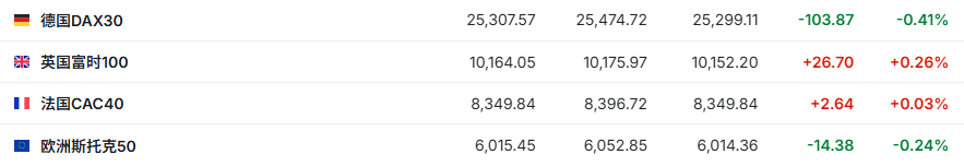 2.截至发稿,德国DAX指数跌0.41%,英国富时100指数涨0.26%,法国CAC40指数涨0.03%,欧洲斯托克50指数跌0.24%。
