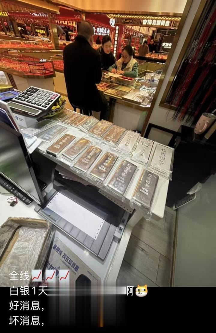 今天,杭州白马珠宝市场一楼一家商户晒出了满桌子的投资银条,并在朋友圈说:好消息是昨天买的都赚了,坏消息,拿货加价。