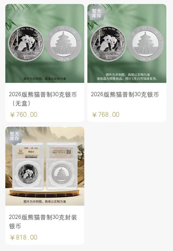 今天,“金币云商”App显示,陆先生此前花598元一枚购买的2026版熊猫币普制30克银币,今天最新价格为768元(无库存),而封装版的已经涨到了818元(无库存)。