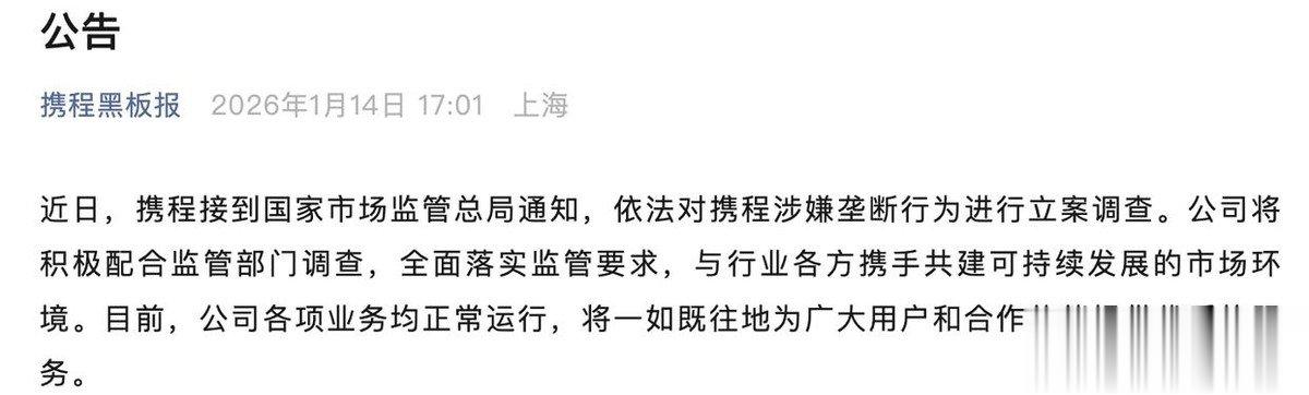 2026年1月14日,市场监管总局公告,依据《中华人民共和国反垄断法》对携程集团涉嫌滥用市场支配地位行为正式立案调查。