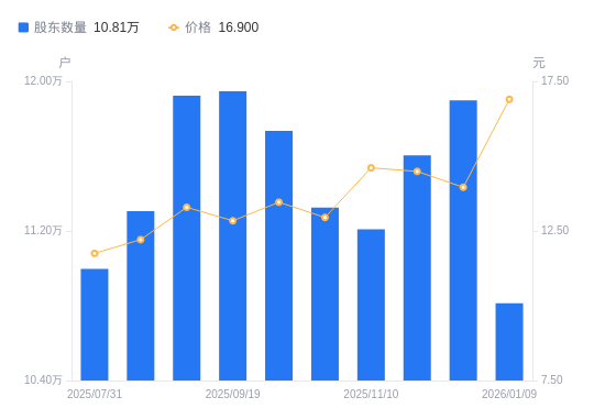 日期A股户数(户)流通A股户均持股数(股)户均持股市值(万元)2026-01-091081368454.2614.292025-12-101189847683.4710.732025-11-281160387878.5411.422025-11-101120868156.3311.922025-10-201132518072.4210.452025-09-301173587789.9310.492025-09-191194667652.479.832025-09-101192297667.6810.192025-08-201130618085.999.872025-07-311099668313.579.77