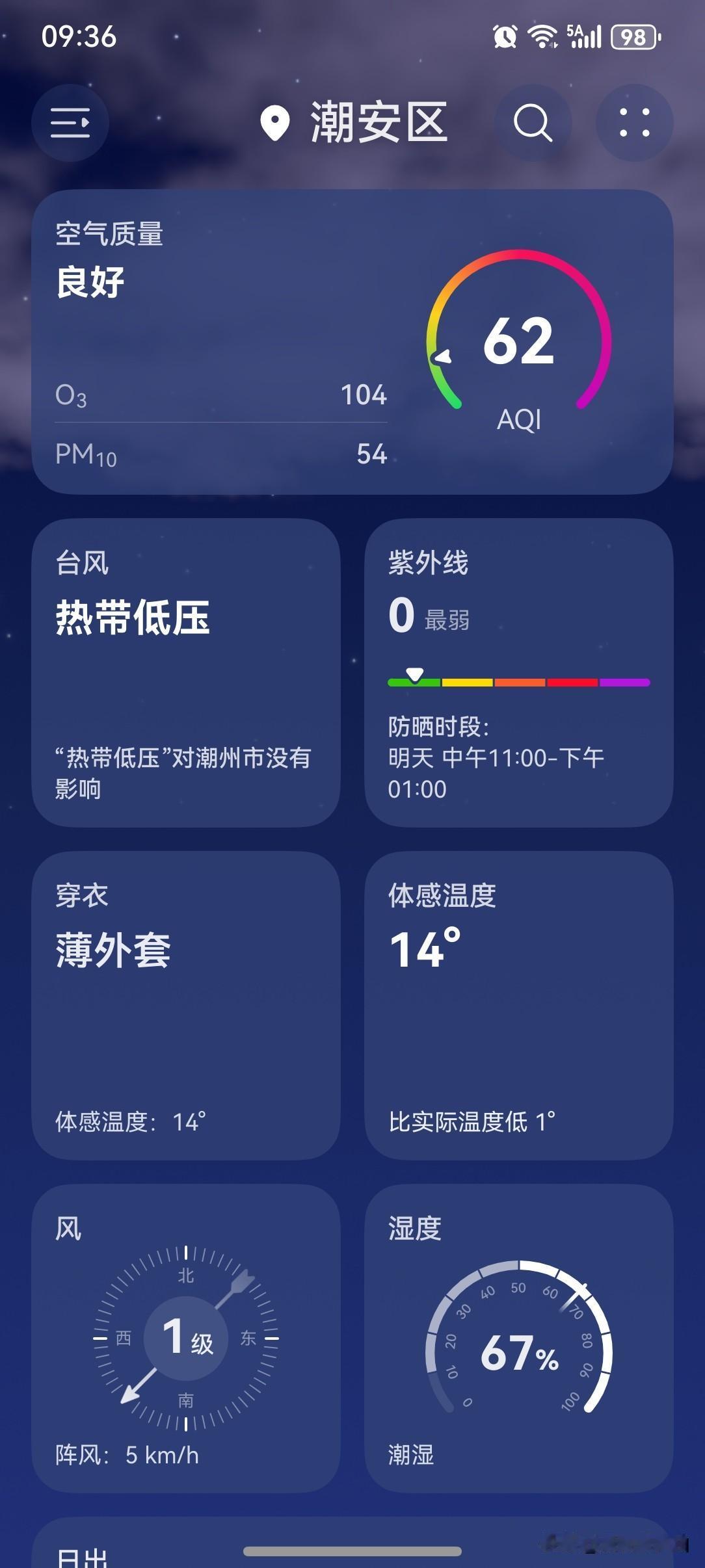 2026年首个台风或将出现?广东“落雨”套餐有着落吗? 未来三天,广东南部沿海市县云量逐渐增多,部分市县偶有零星小雨,其余大部市县晴间多云,全省大部市县气温逐渐回升,昼暖夜冷——白天暖洋洋,早晚冷冰冰!昼夜温差较大,需要注意适时添加衣物,别让感冒病毒有机可乘! 今天(14日),潮州喜提一个晴天,气温10~24℃,此刻气温15℃,体感温度14℃。 广东牌烘干机持续发力,天气晴朗干燥,白天在阳光的加持下,气温噌噌地往上升,穿着短袖也毫无违和感。 不过,等到太阳一下山,气温又跌到了谷底,这时穿上羽绒服也是很有必要的。 毕竟早晚的气温是真的非常低,昼夜温差10℃以上是最近的天气常态。 短袖在早晚时段真的扛不住的,咱得听劝啊!听人劝才能吃饱饭! 早出晚归的小伙伴们,出门前记得把外套带上哦!早晚气温还是蛮低的,需要注意防寒保暖。