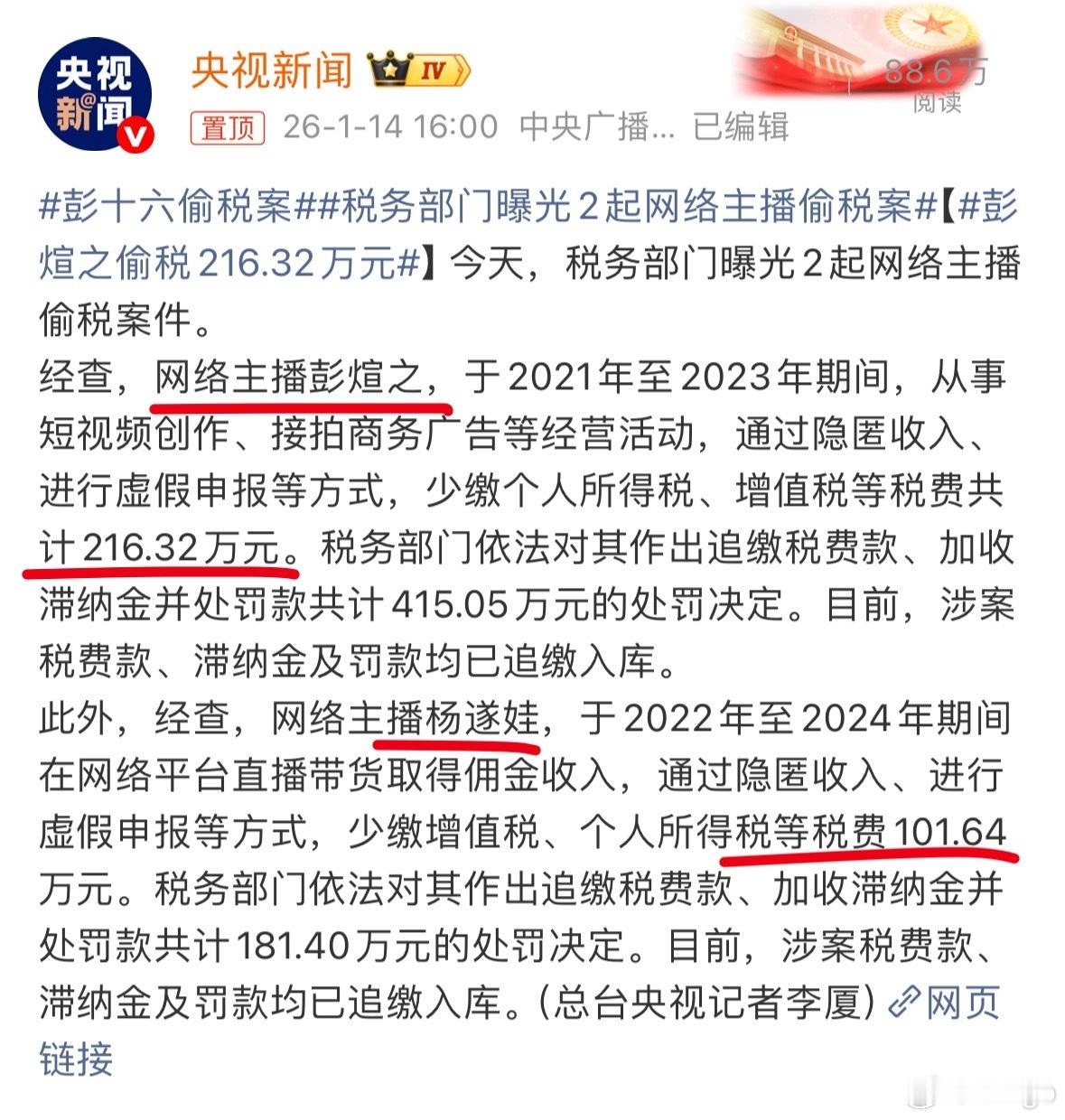 彭十六偷税案好嘛,又是两个从来没听过的头部网红, 一个偷税216.32万,一个偷税 101.64万
