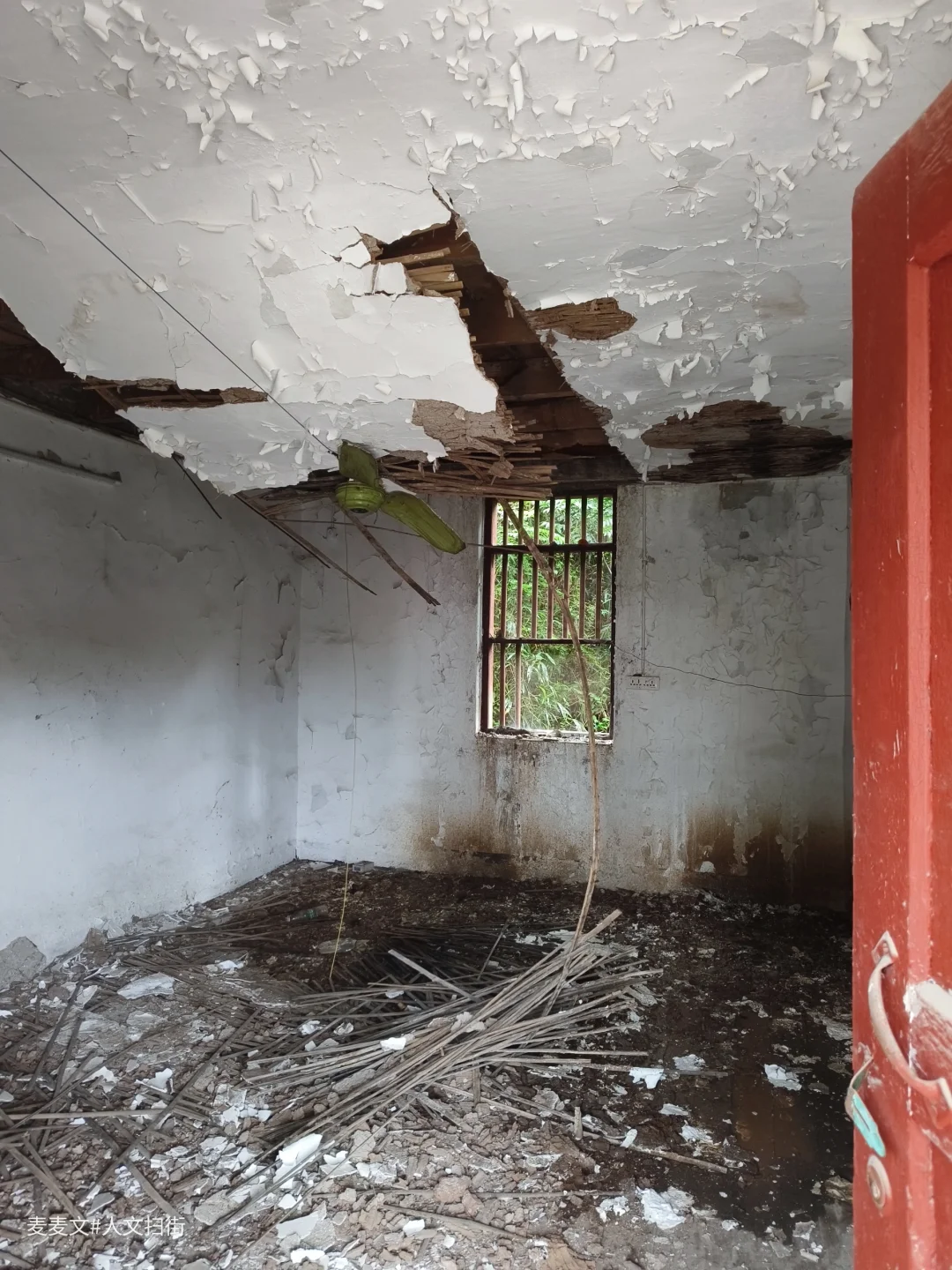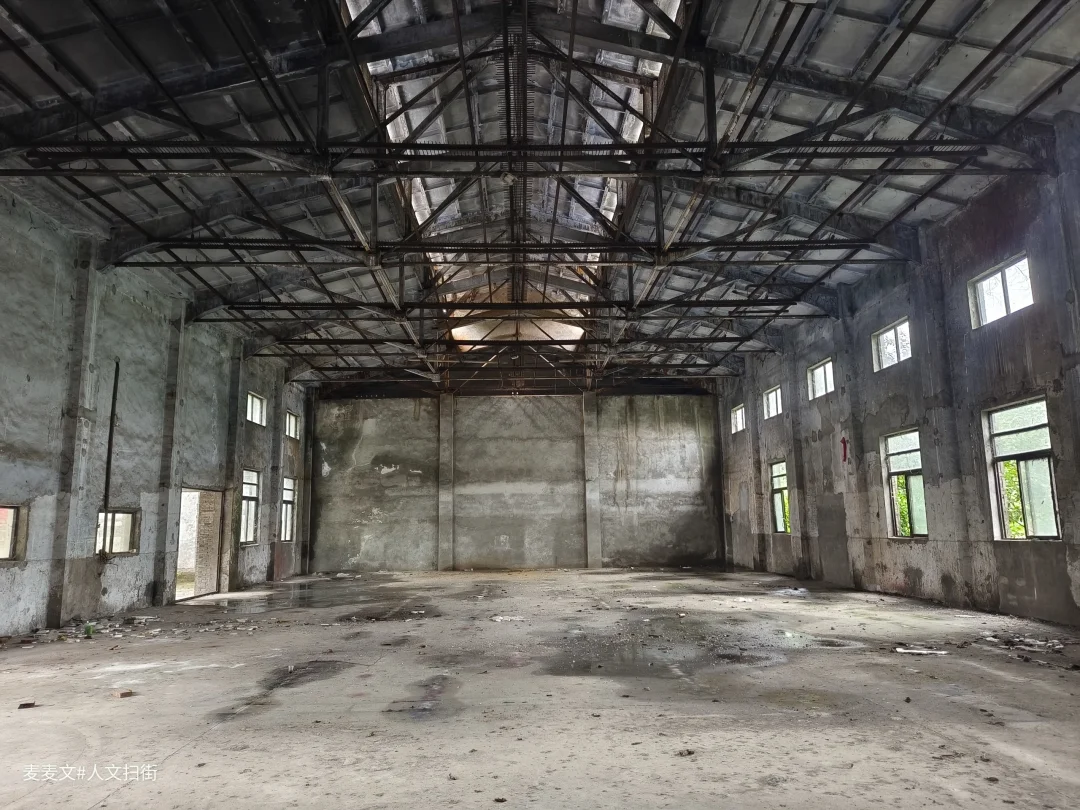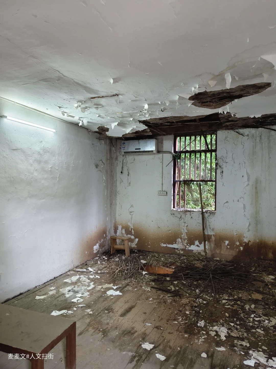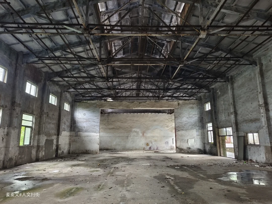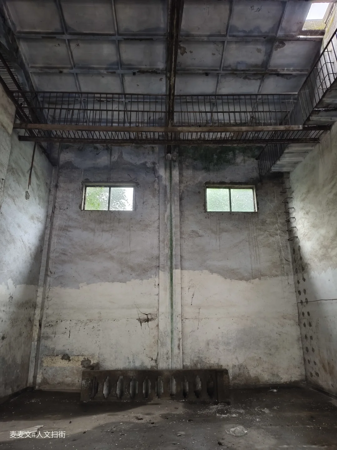想当年,这个礼堂里大约也演过戏,开过会,或者只是挤满了人,喧哗着,热闹着。而今却空荡荡的立在原地,只剩钢架支撑着半边天。外墙青砖斑驳,绿植从砖缝里钻出,生机与衰败彼此渗透。新换的铝合金窗户倒映着灰白天空,像是硬生生给老建筑装了一副现代义肢。 旁边这幢三层楼的办公楼,像被掏空了内脏。墙皮成片剥落,红漆木门和地板褪成灰褐。上下楼的木楼梯,一脚踩下去,灰尘扑簌,吱嘎作响。推开一间办公室,天花板已垮塌大半,暴露出黑黢黢的房梁,碎石灰和断木横斜,像一场小型坍塌的现场。