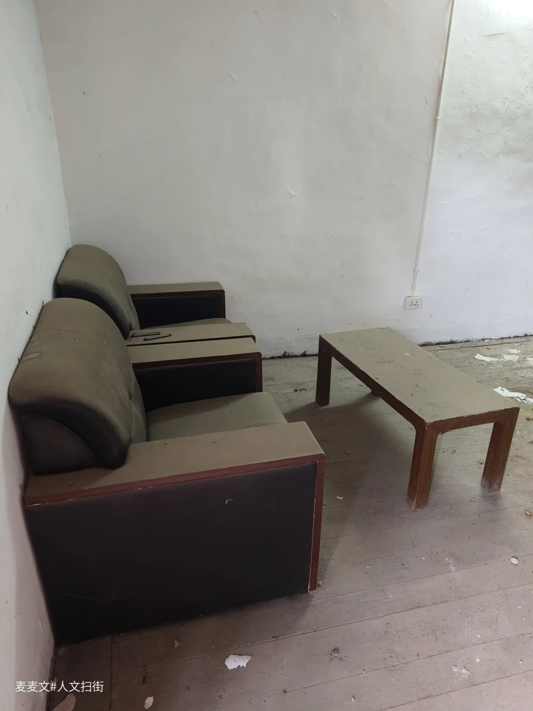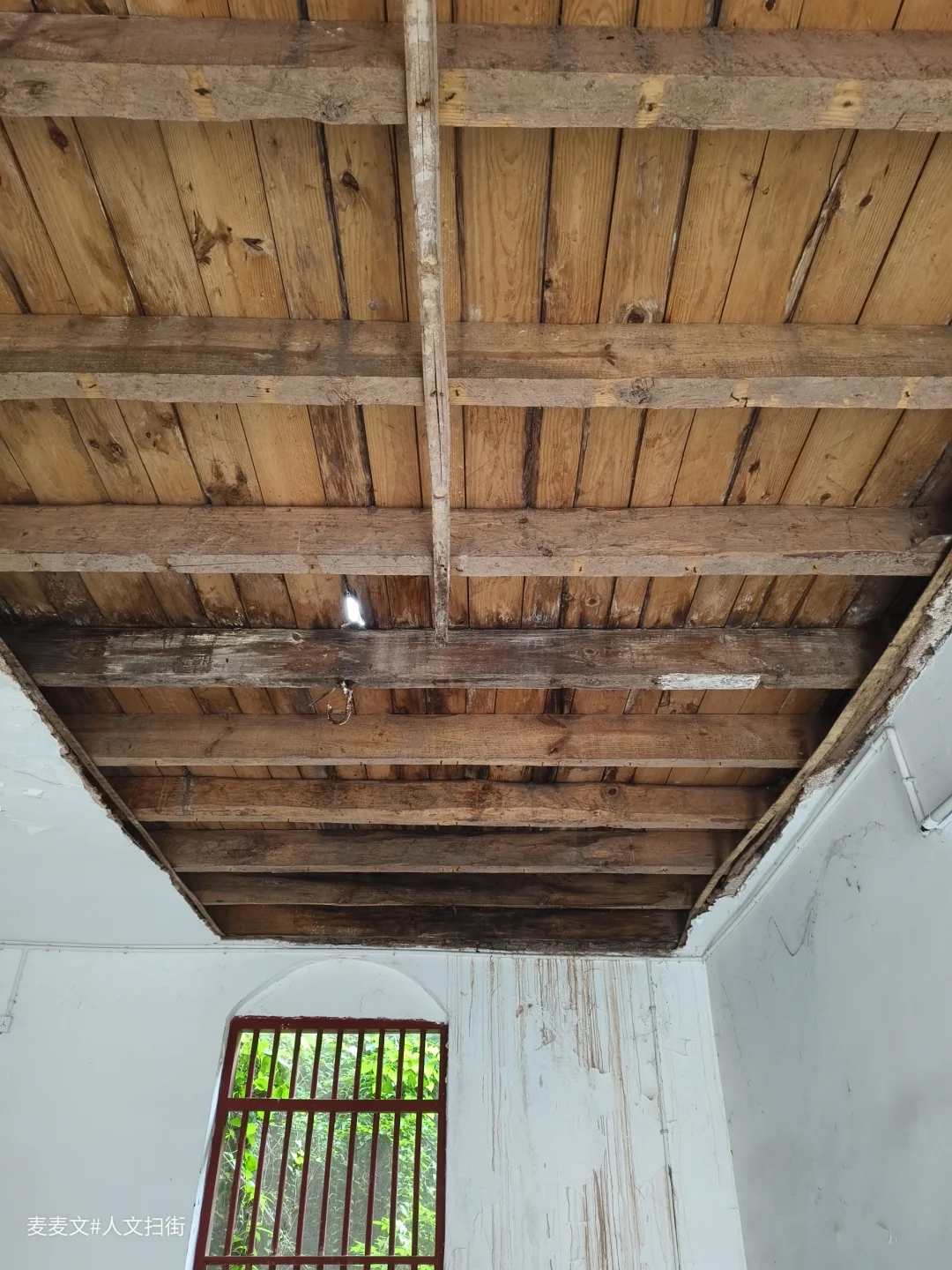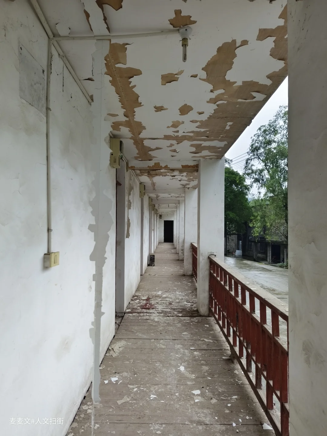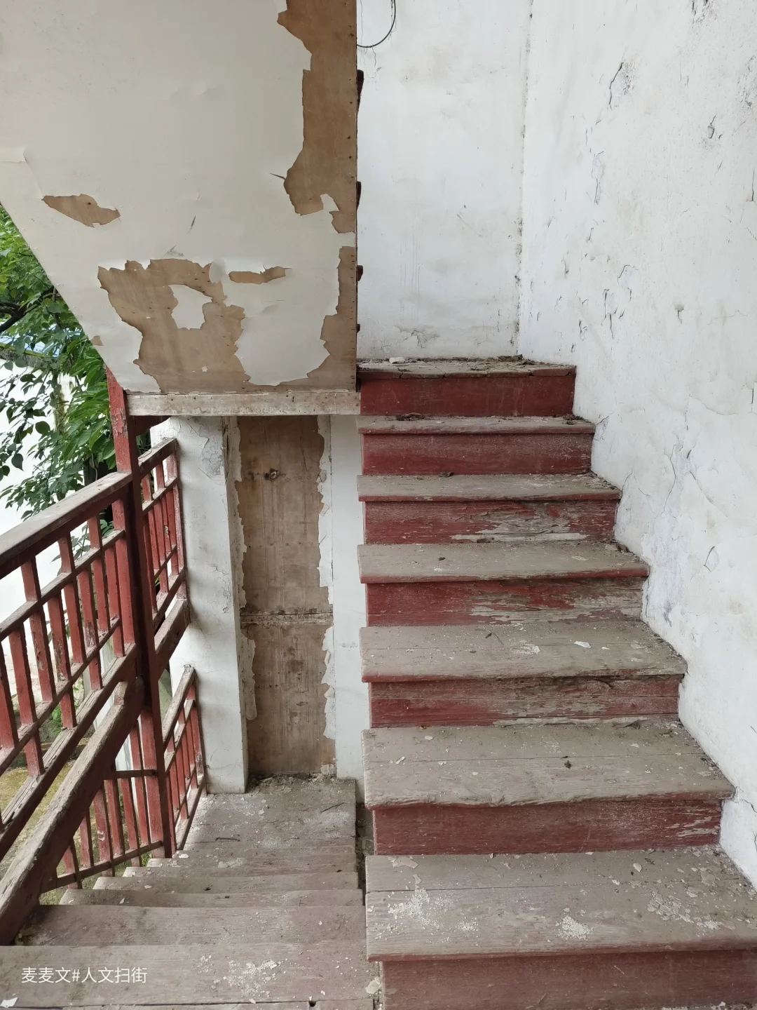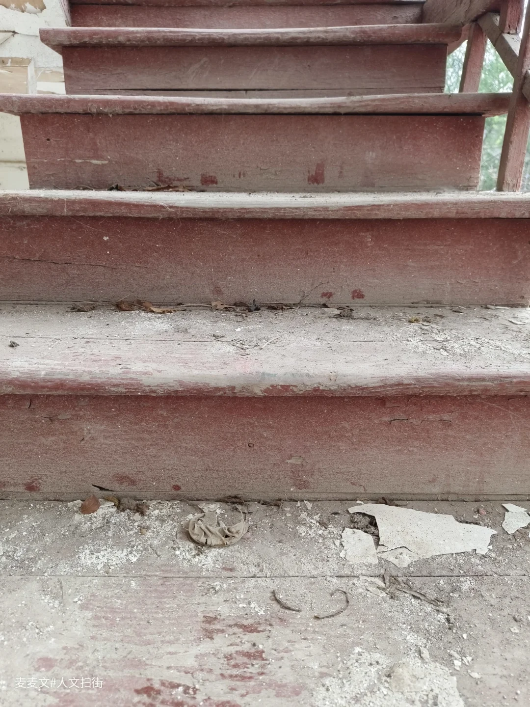 想当年,这个礼堂里大约也演过戏,开过会,或者只是挤满了人,喧哗着,热闹着。而今却空荡荡的立在原地,只剩钢架支撑着半边天。外墙青砖斑驳,绿植从砖缝里钻出,生机与衰败彼此渗透。新换的铝合金窗户倒映着灰白天空,像是硬生生给老建筑装了一副现代义肢。 旁边这幢三层楼的办公楼,像被掏空了内脏。墙皮成片剥落,红漆木门和地板褪成灰褐。上下楼的木楼梯,一脚踩下去,灰尘扑簌,吱嘎作响。推开一间办公室,天花板已垮塌大半,暴露出黑黢黢的房梁,碎石灰和断木横斜,像一场小型坍塌的现场。