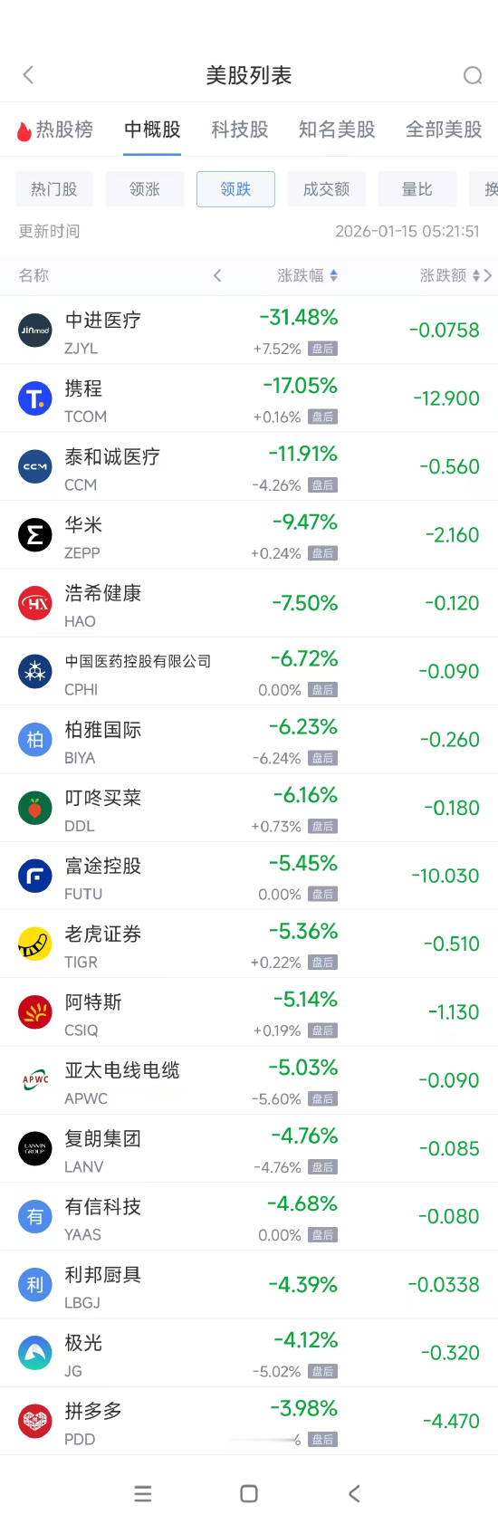 领跌中概股列表: