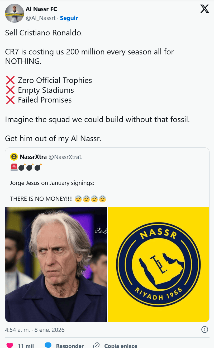 这位用户名为@Al_Nassrt的球迷随后补充道:“CR7每个赛季让我们付出2亿,却一无所获。零官方冠军、空荡荡的球场、落空的承诺。想象一下,如果没有这块‘化石’,我们能打造怎样一套阵容。让他离开我们利雅得胜利。”