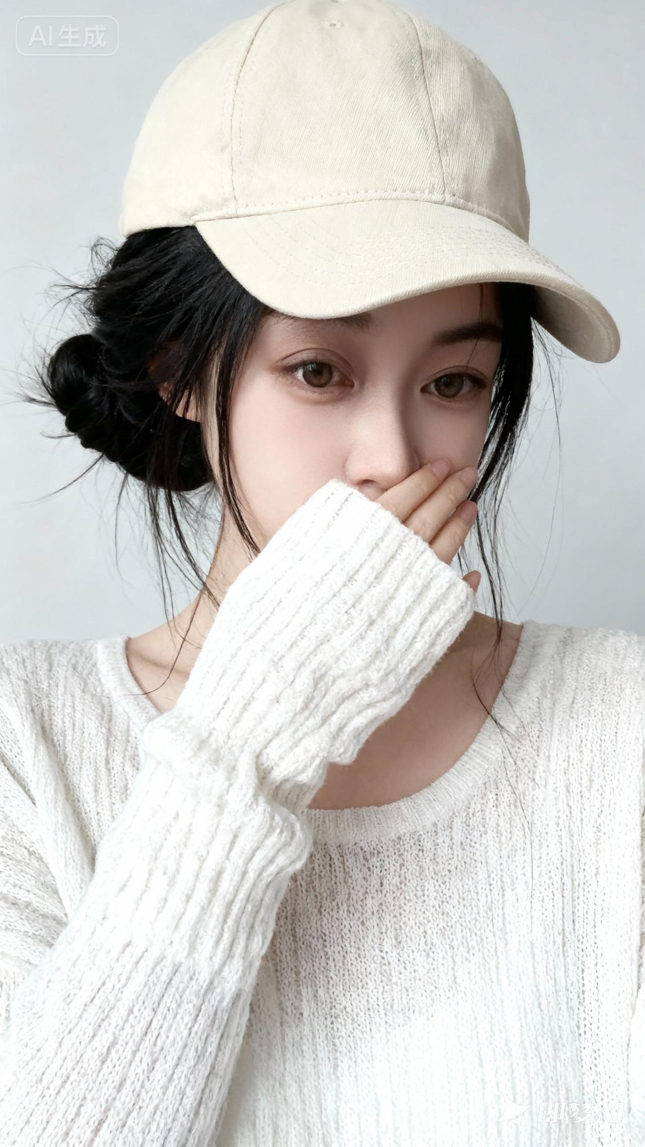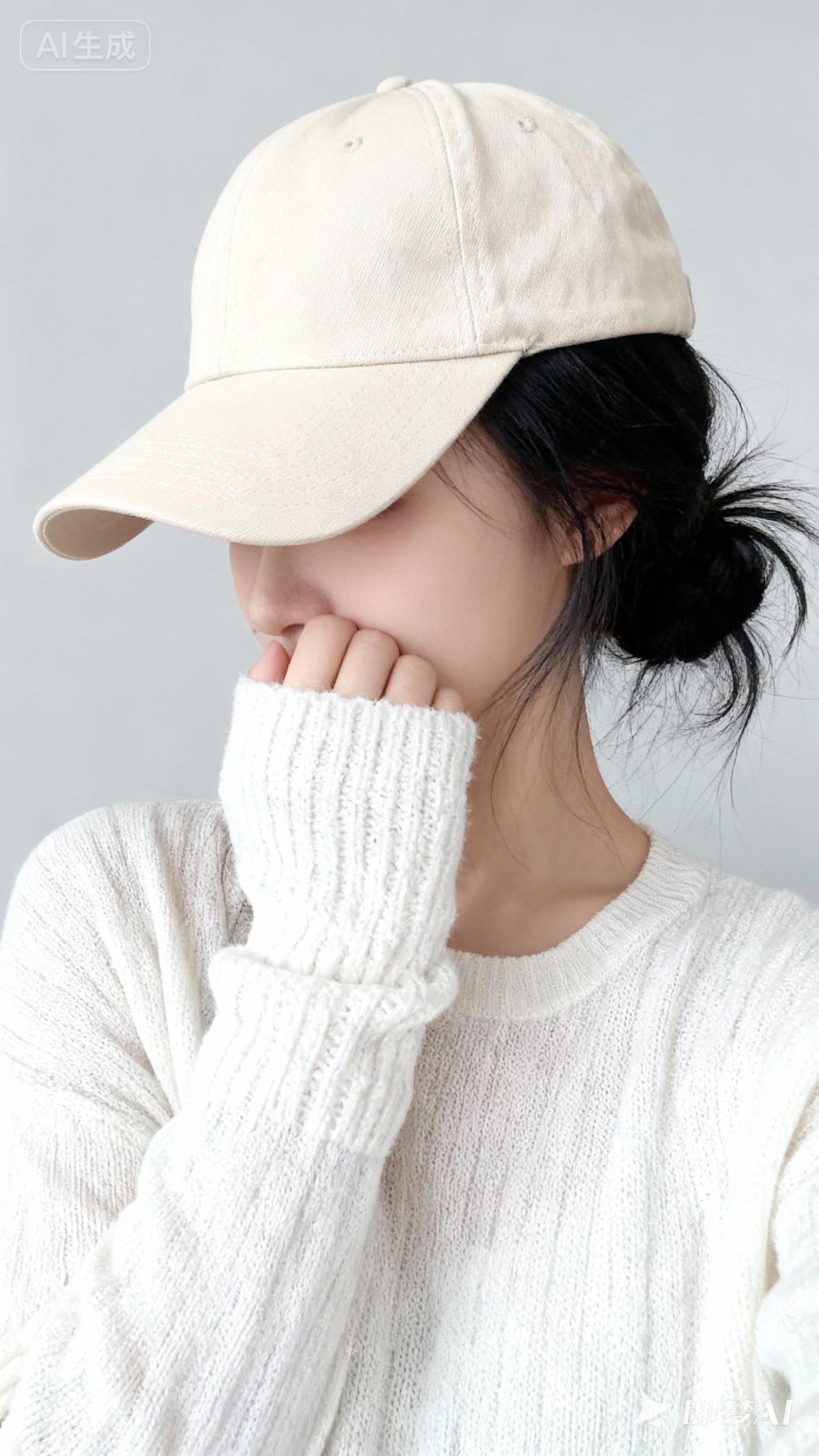 一位女性,黑色长发挽成慵懒的发髻,几缕发丝散落。头戴米色棒球帽,帽檐微微压低。身着白色针织长袖上衣,衣身纹理清晰,质感柔软。她用戴着白色针织袖套的手轻掩面部