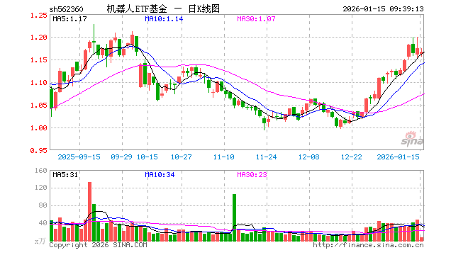 1月15日,机器人ETF基金(562360)开盘跌1.02%,报1.162元。机器人ETF基金(562360)重仓股方面,汇川技术开盘跌0.08%,科大讯飞跌1.56%,石头科技跌0.72%,大华股份跌0.98%,中控技术跌3.37%,大族激光跌0.02%,双环传动跌0.16%,科沃斯跌0.55%,机器人跌1.72%,云天励飞跌0.93%。