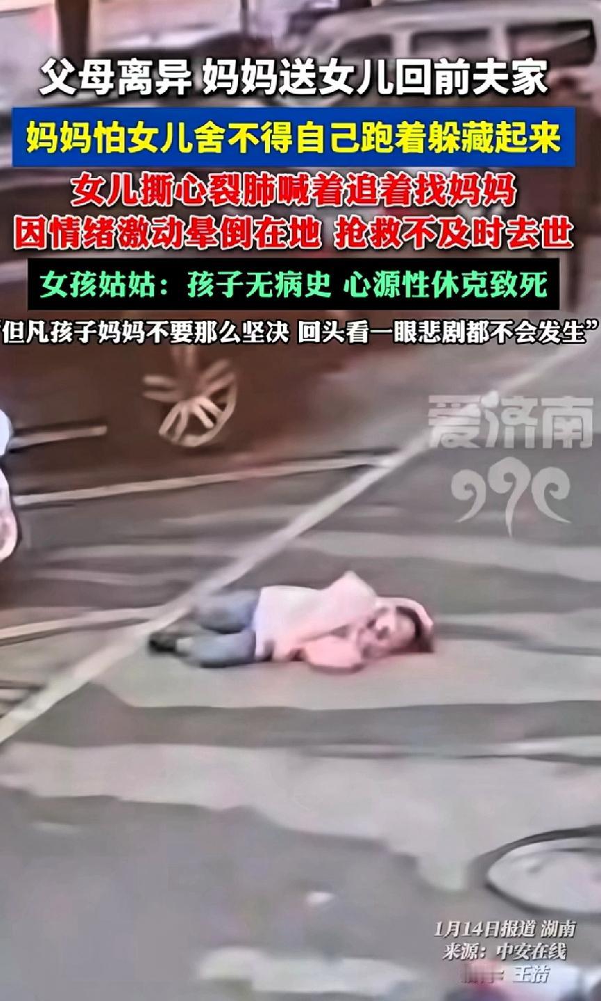 父母离异,妈妈送女儿回前夫家,妈妈怕女儿舍不得自己跑着躲起来。女儿看不到妈妈撕心裂肺的喊着追妈妈,因情绪激动晕倒抢救不及时离世。 女孩姑姑:孩子没有病史,心源性休克致死。 2026年1月湖南这起悲剧真让人痛心。父母离异,妈妈把9岁女儿送回前夫家,怕女儿不让走就跑着躲起来。女儿发现妈妈不见,撕心裂肺地追着喊,最后情绪太激动晕倒,因心源性休克抢救不及时去世。 当妈妈的更看不得这种新闻,孩子太小需要家人保护,这种保护不光是日常生活中,还有心理上的、精神上的。离异家庭的孩子更需要大人细心照顾。 女孩姑姑说孩子没病史,要是妈妈不跑那么坚决,回头看一眼,或许悲剧就不会发生。心源性休克很危险,成因有心肌梗死、心肌炎等。 这也提醒大家平时要保护心脏健康,遇到这类患者也要正确急救。唉,希望这样的悲剧不要再发生了。