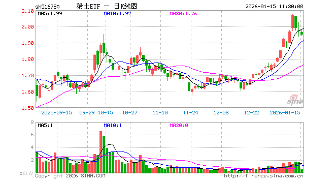 1月15日,截止午间收盘,稀土ETF(516780)跌1.02%,报1.949元,成交额1.05亿元。稀土ETF(516780)重仓股方面,北方稀土截止午盘涨1.30%,卧龙电驱跌0.93%,领益智造跌1.65%,中国稀土涨1.97%,盛和资源涨1.03%,格林美涨3.11%,金风科技跌10.01%,包钢股份涨0.39%,厦门钨业涨1.78%,中国铝业涨1.39%。