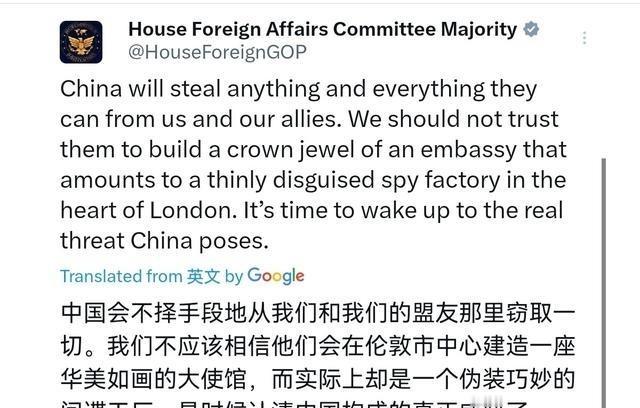 美国众议院外交事务委员会对我们放话了!1月14日,美国众议院外交事务委员会声称,中国会从我们和我们的盟友那里“窃取”任何东西。我们不应该相信他们会在伦敦市中心建造一座皇冠上的明珠般的大使馆,它相当于一个几乎不加掩饰的“间谍”工厂。是时候意识到中国构成的真正“威胁”了。 事情的导火索是英国媒体曝光了中国驻英国大使馆新馆的详细规划图纸。这座新馆选址在伦敦塔对面的前皇家铸币厂旧址,规划占地超过2.2万平方米,属于目前中国在欧洲最大的使馆项目。图纸里最让人议论纷纷的是地下部分,公开文件显示有208间标注为“保密用途”的房间,其中一个三角形大空间直接挨着曼塞尔街下方的主干光纤电缆。这些电缆是伦敦金融城通往金丝雀码头的关键节点,承载大量跨大西洋金融数据和政府通信。 穆伦纳尔接受多家美国媒体采访,直截了当把这个项目称为“几乎不加掩饰的间谍工厂”。他说,中国政府借新建使馆的机会,靠近核心通信基础设施,很可能用于情报收集活动。他特别提到,美国的数据传输线路也经过这些电缆,所以这件事不光威胁英国,也威胁整个五眼联盟的安全。他呼吁英国政府立刻暂停审批,重新评估整个项目对中国和西方构成的风险。穆伦纳尔这番话不是随便说说,他作为委员会主席,过去两年一直在推对华强硬法案,这次表态属于委员会公开立场的一部分。 实际情况是,中国驻英使馆现在的馆舍确实老旧狭小,办公条件跟不上正常外交需求,所以多年前就向英国政府正式申请在新址建馆。整个流程走的是标准程序,按照《维也纳外交关系公约》办事,先地方规划部门审核,后来因为争议太大,转到中央政府层面决定。英国政府内部评估过多次,国家安全部门也参与审查,但到现在还没给出最终批复。地方议会此前几次否决,主要理由是建筑规模太大、影响周边历史风貌和交通,但安全担忧一直被反复提起。 美国这边插手得比较直接。穆伦纳尔不是一个人在发声,白宫和国务院也有官员私下跟英国沟通,表达类似关切。英国议会里,保守党、工党都有议员跳出来质询,影子内政大臣要求公开解释为什么允许外国使馆这么靠近关键通信干线。媒体把这件事炒得沸沸扬扬,标题一个比一个耸动,有人直接写“中国要在伦敦建欧洲最大间谍基地”。 中国外交部回应得很干脆。发言人说,新馆建设完全是正常外交需要,目的是改善办公环境、更好服务中英关系和侨民事务,所有程序合法合规。所谓“窃取”“间谍工厂”的说法纯属恶意抹黑,没有任何事实依据。外交部还顺带点了一句,美国才是全球监听能力最强的国家,斯诺登文件早就把这事抖出来了,现在倒反过来指责别人,挺没说服力的。 这件事放到更大的背景下看,其实反映了当前中美在全球博弈的几个特点。第一,美国国会越来越把对华竞争当成头等大事,不管是科技、供应链还是外交设施,都要卡脖子。第二,英国夹在中间很尴尬,既要维持对美同盟,又不想把对华关系搞僵,毕竟中国是英国第二大贸易伙伴,经贸联系紧密。第三,中国海外使领馆建设本来是常规操作,但现在只要规模稍大、位置敏感,就容易被扣上安全帽子,变成政治攻击的靶子。 目前新馆项目还在审批流程里,英国政府没松口,也没彻底否决。穆伦纳尔和委员会大概率还会继续拿这件事做文章,配合其他法案一起推,比如限制对华投资、加强盟友情报共享之类的。英国那边估计也得拖一段时间,等风头过去再做决定。说白了,这事短期内不会有结果,但已经把中英关系里的安全信任裂痕又拉大了一点,也让大家更清楚看到,美国现在对中国的海外存在有多敏感。 总的来说,美国众议院这回放话,话说得重,目的就是制造压力,试图影响英国的最终决定。中国这边立场没变,该建馆还是要建,该反击抹黑还是要反击。事情发展到哪一步,就看接下来几个月伦敦和华盛顿谁的嗓门更大,谁的牌更多了。现实就是这么骨感,外交从来都不是讲道理的地方。