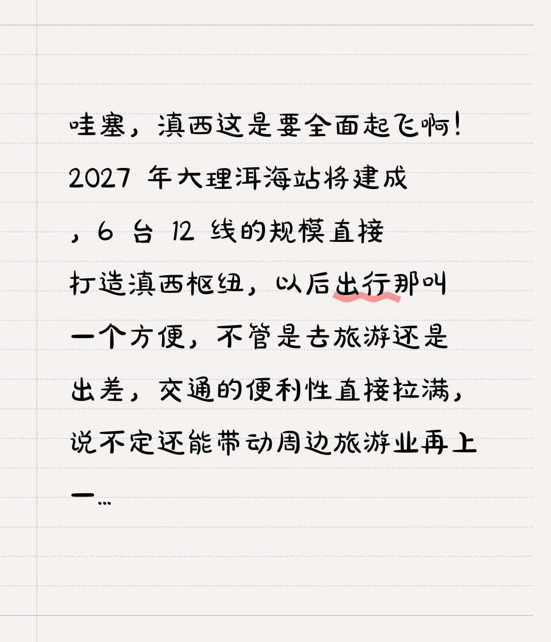 哇塞,滇西这是要全面起飞啊!2027 年大理洱海站将建成,6 台 12 线的规模直接打造滇西枢纽,以后出行那叫一个方便,不管是去旅游还是出差,交通的便利性直接拉满,说不定还能带动周边旅游业再上一个台阶。 还有 2026 年的汽车以旧换新政策,最高补贴 2 万元,这对于想换车的朋友来说简直是福音,能省一大笔钱呢。 另外,滇西中心医院凤仪院区都已经启用了,还配备百台高端设备能提供全方位体检服务,以后健康方面也有了更可靠的保障。滇西这是在交通、消费、医疗各方面全面开花,未来可期啊!
