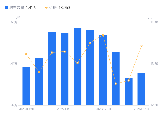 日期A股户数(户)流通A股户均持股数(股)户均持股市值(万元)2026-01-09141338862.4112.362025-12-31139948950.4411.892025-12-19147418496.8711.232025-12-10152378220.2811.642025-11-28153898139.0911.402025-11-20154418111.6811.052025-11-10152898192.3211.342025-10-31153218175.2111.302025-10-20145768593.0611.552025-09-30143148750.3412.07