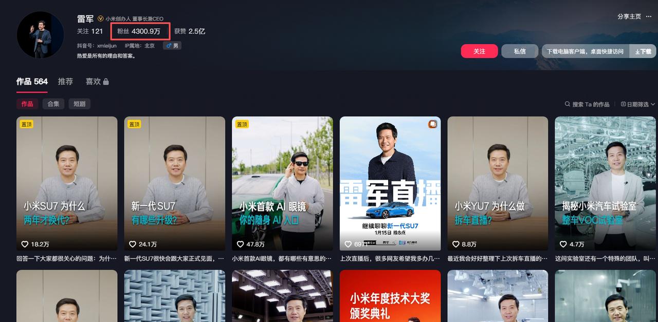 是不是有点频繁了啊?今天晚上,雷军将再次进行直播,深入介绍小米SU7的改款。这是雷军1月份前半月的第3场直播了,总感觉有点频繁了。 可以看到,在最近的各大社交平台上,雷军还是相当活跃的,尤其是WB,每天都会有很多条的内容发布。 有个问题,那就是从小米汽车发布以来,雷军的标签一直和小米汽车进行了深度捆绑,雷军也成为了小米汽车营销推广的核心“招牌”,这个到底是好是坏呢? 还有,在上次直播中,雷军提到了抖音掉粉的事儿,他说计划在这月底实现粉丝的增长,我刚看了一下,粉丝又是继续在掉了。