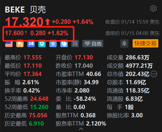 贝壳港股上涨2.5%,带动贝壳(BEKE.US)美股盘前涨1.6%。消息上,中国人民银行副行长邹澜15日表示,2025年12月,新发放企业贷款加权平均利率和新发放个人住房贷款加权平均利率都大约在3.1%左右,自2018年下半年分别下降了2.5个百分点和2.6个百分点。会同金融监管总局,将商业用房购房贷款最低首付比例下调至30%。有分析称,该政策对贝壳是直接的利好消息。央行将商业用房(商铺、写字楼等)贷款首付比例下调至30%,有利于激活商办市场交易,这将对贝壳的核心业务带来积极影响。