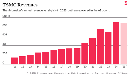 随着全球生产生活逐步回归常态,芯片需求随之回落,台积电工厂的订单量也同步下降。2023年,尽管人工智能芯片需求已开始兴起,但台积电全年营收仍较2022年下滑8.7%。