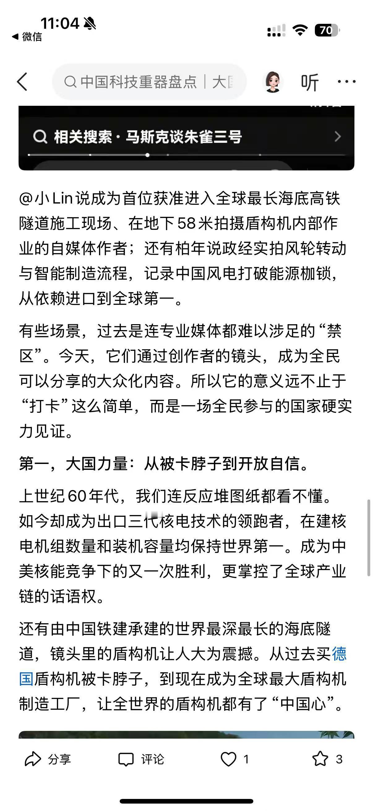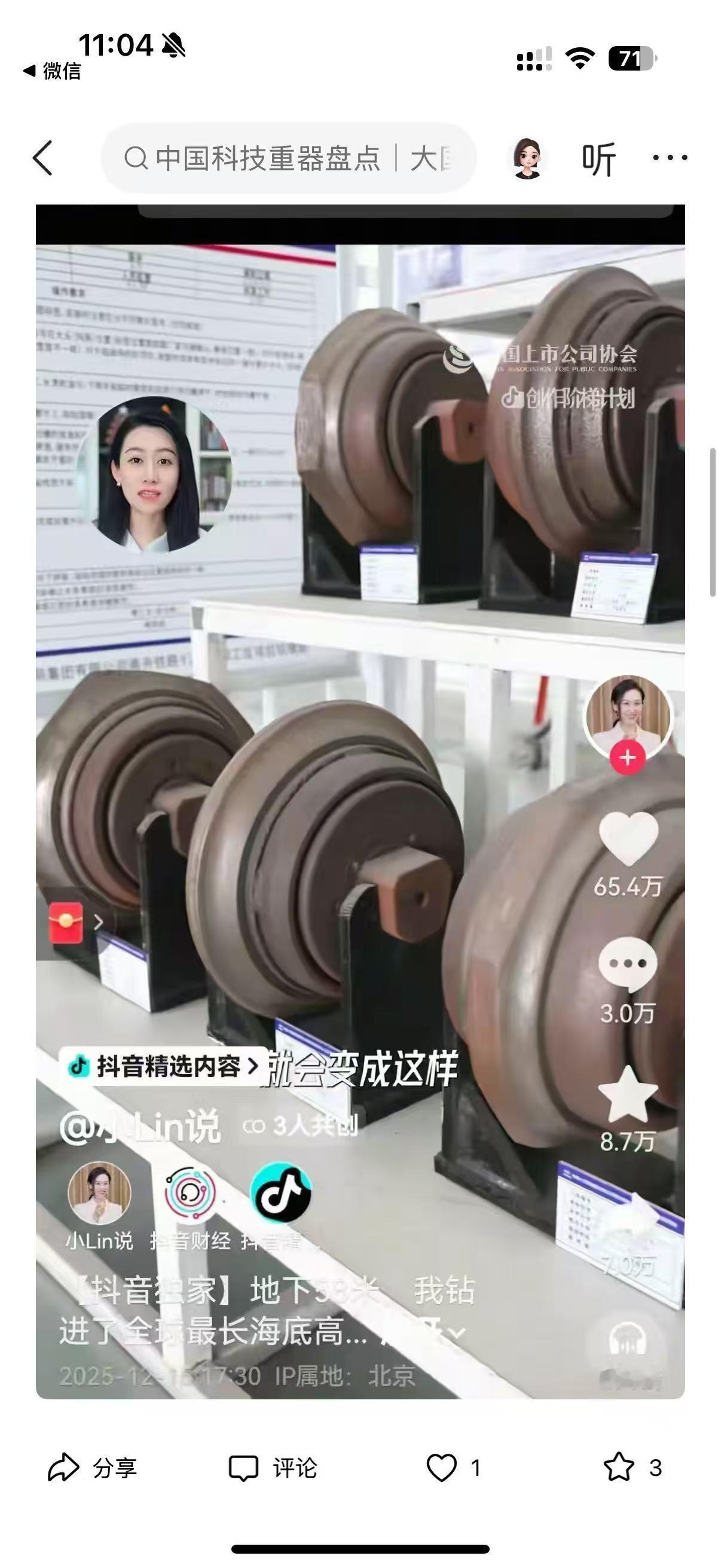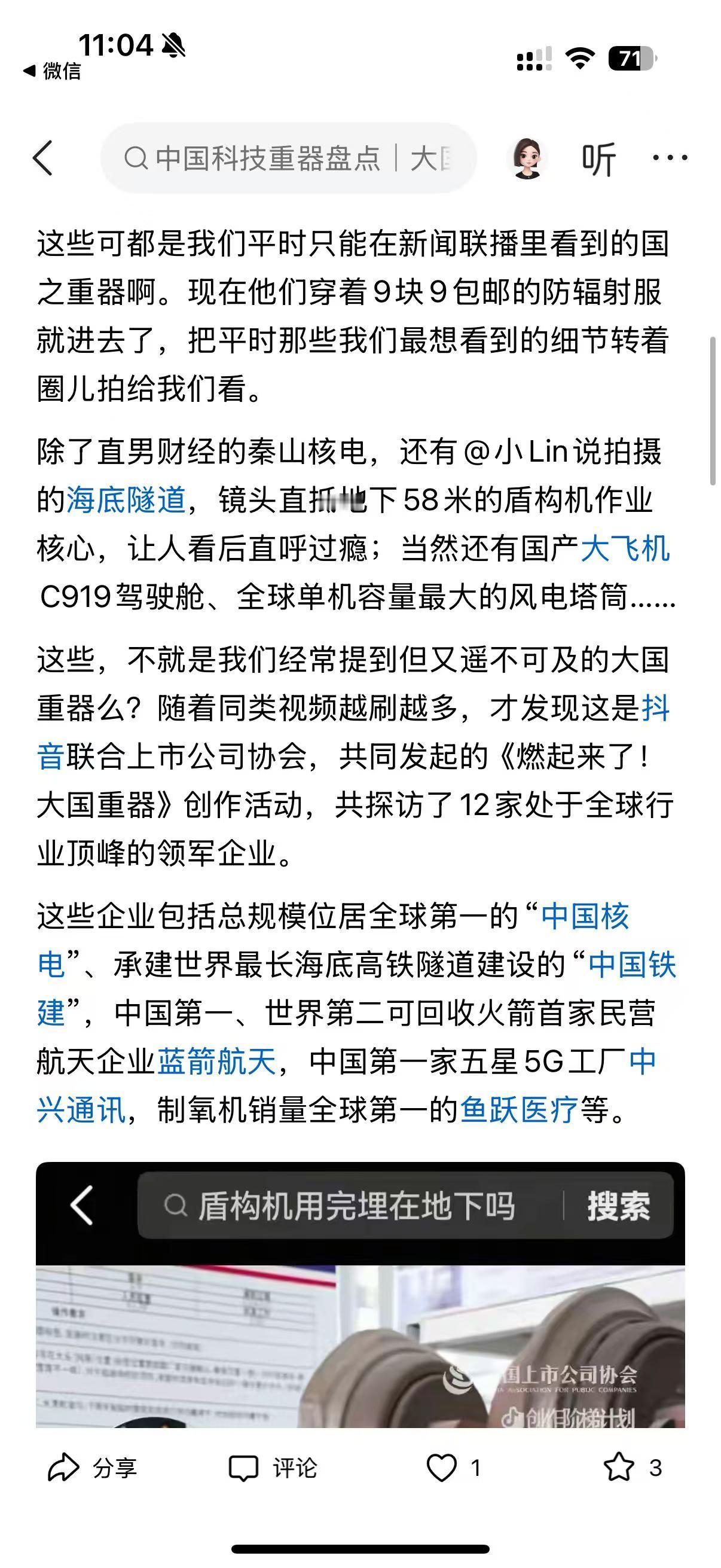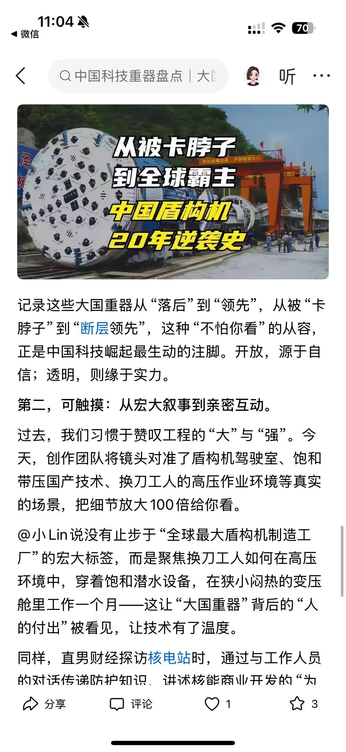 家人们,最近刷到平台上的大国重器系列视频,真的被狠狠震撼到了!谁能想到,以前只能在新闻里看到的核电站、火箭、海底隧道,现在被自媒体博主带着近距离探秘,看得人热血澎湃! 这是联合上市公司协会发起的活动,53 位创作者走进 12 家顶尖企业,拍了 56 条视频,播放量直接破 40 亿!有@直男财经穿 9 块 9 防辐射服闯秦山核电,@小 Lin 说钻进地下 58 米拍海底隧道盾构机,还有朱雀三号可回收火箭的完整发射过程,全是以前连专业媒体都难拍到的细节! 从被卡脖子到全球领跑,中国科技真的太牛了!秦山核电成了出口技术的领跑者,盾构机从依赖进口到全球最大制造工厂,还有 700 公里 / 小时的磁悬浮、1 亿摄氏度的人造太阳… 更戳人的是,视频里不仅有硬核技术,还有换刀工人、核电工作人员的坚守,让科技有了温度。作为中国人,真的太骄傲了!你们刷到这些视频了吗?哪个重器最让你惊艳?
