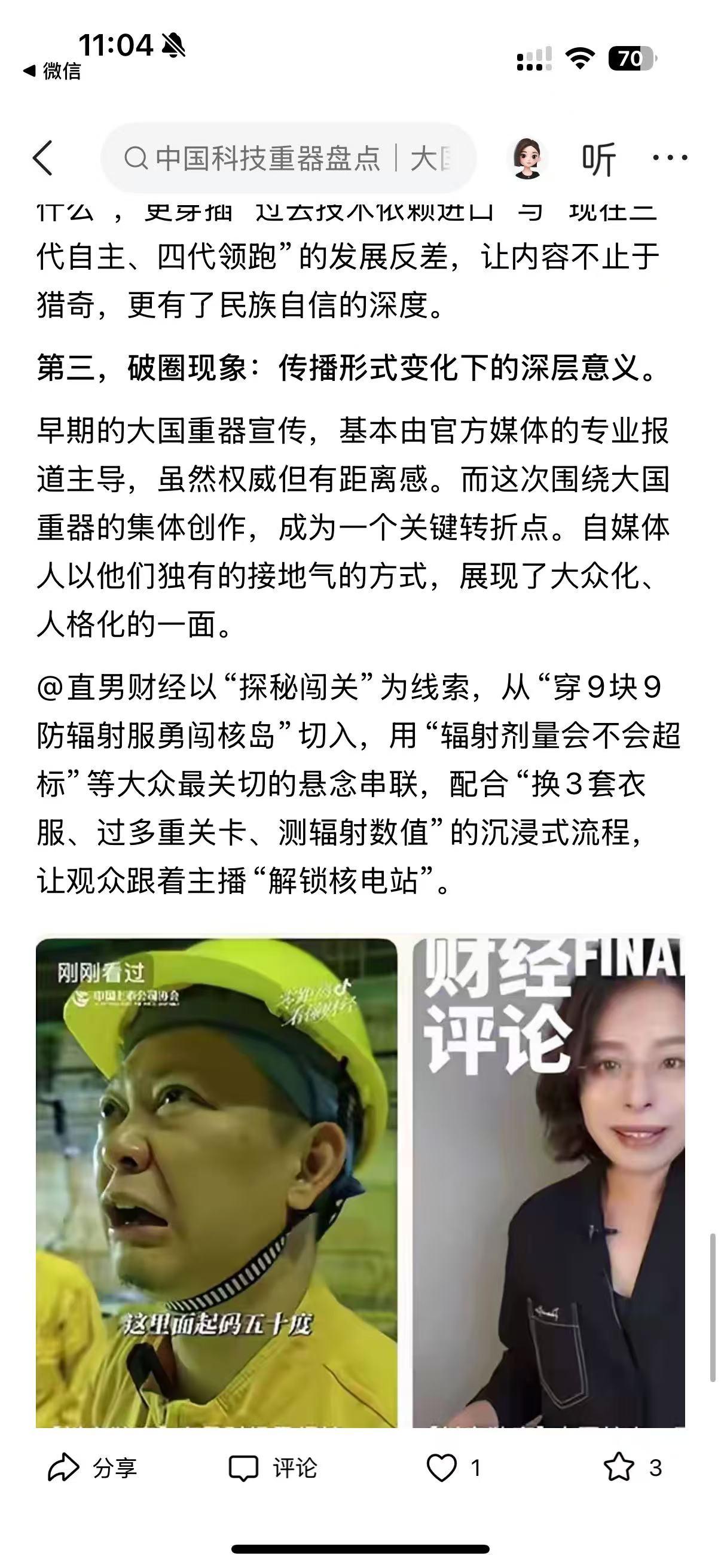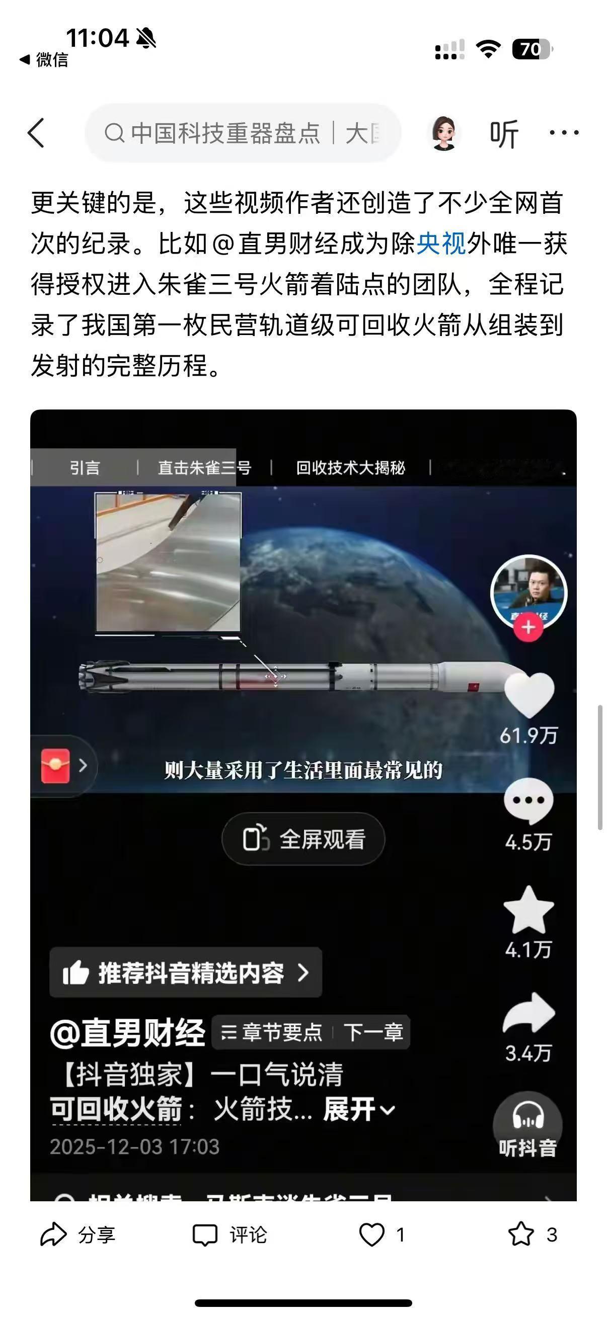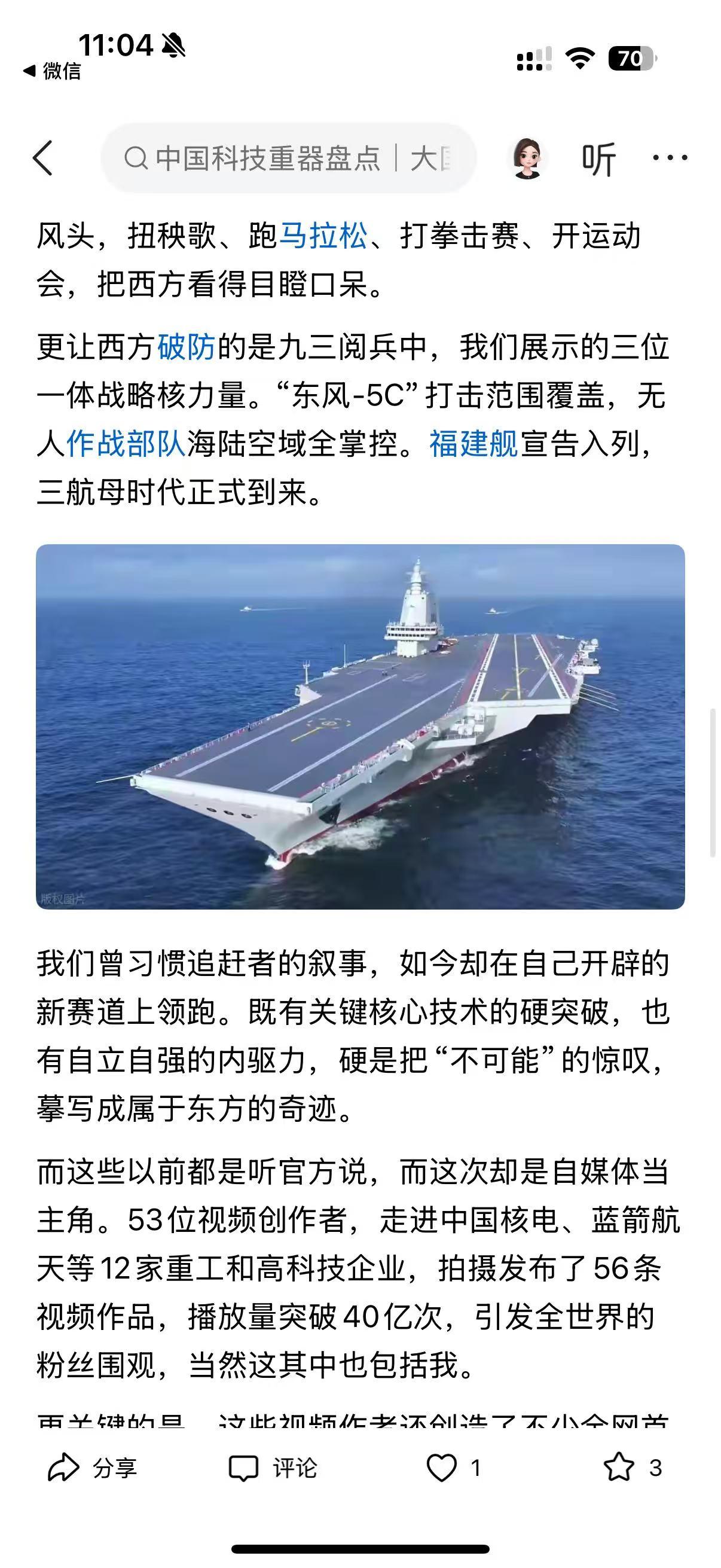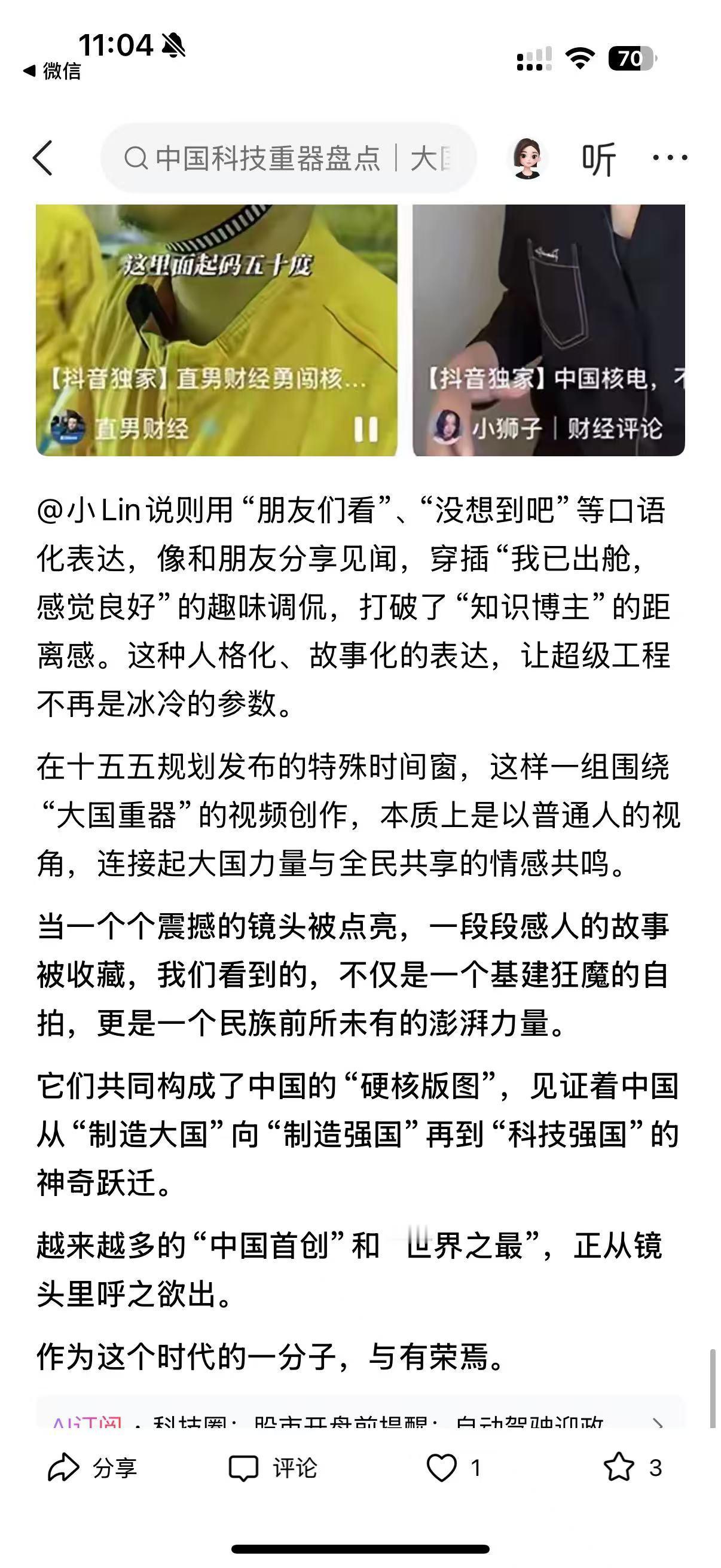 家人们,最近刷到平台上的大国重器系列视频,真的被狠狠震撼到了!谁能想到,以前只能在新闻里看到的核电站、火箭、海底隧道,现在被自媒体博主带着近距离探秘,看得人热血澎湃! 这是联合上市公司协会发起的活动,53 位创作者走进 12 家顶尖企业,拍了 56 条视频,播放量直接破 40 亿!有@直男财经穿 9 块 9 防辐射服闯秦山核电,@小 Lin 说钻进地下 58 米拍海底隧道盾构机,还有朱雀三号可回收火箭的完整发射过程,全是以前连专业媒体都难拍到的细节! 从被卡脖子到全球领跑,中国科技真的太牛了!秦山核电成了出口技术的领跑者,盾构机从依赖进口到全球最大制造工厂,还有 700 公里 / 小时的磁悬浮、1 亿摄氏度的人造太阳… 更戳人的是,视频里不仅有硬核技术,还有换刀工人、核电工作人员的坚守,让科技有了温度。作为中国人,真的太骄傲了!你们刷到这些视频了吗?哪个重器最让你惊艳?