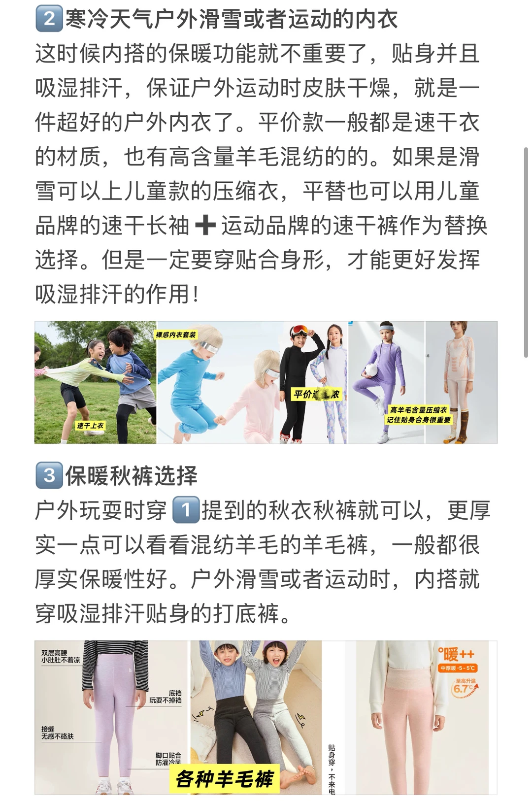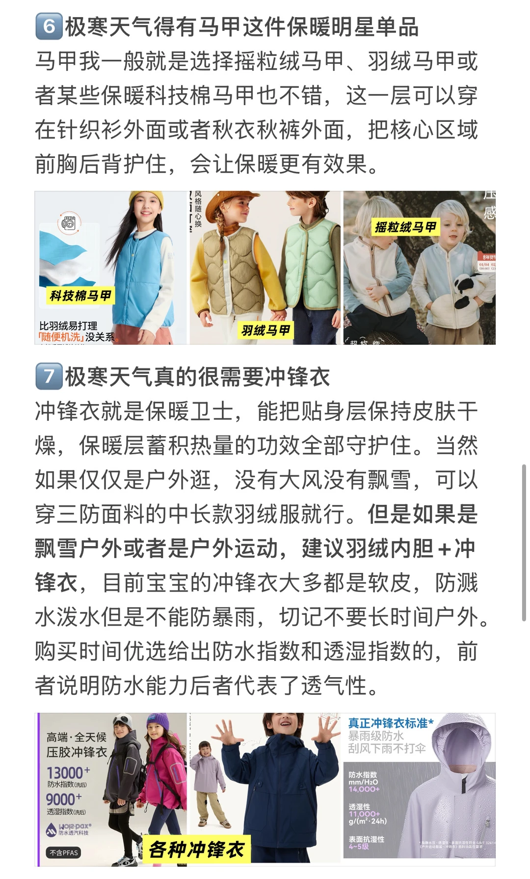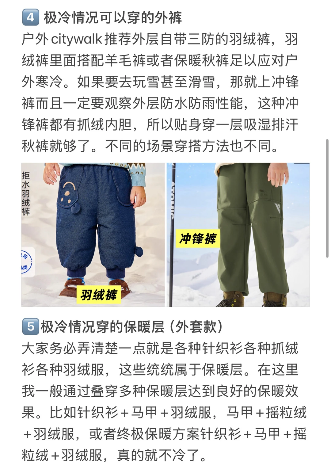 可以穿搭的衣服类型可以参考图片 从里到外,从头到脚都写啦 【具体搭配方式如下】 ✅常规冷:保暖秋衣+摇粒绒外套or针织衫+棉马甲+排骨羽绒服+冲锋衣(排骨羽绒服+冲锋衣可以替换成中长款三防鹅绒服)+羊毛裤+羽绒裤+帽子围巾手套+口罩 ✅极寒冷or户外运动:吸湿排汗内衣+针织衫+摇粒绒外套+棉马甲+排骨羽绒服+冲锋衣+保暖秋裤+冲锋裤(含抓绒内胆)+帽子围巾手套+口罩