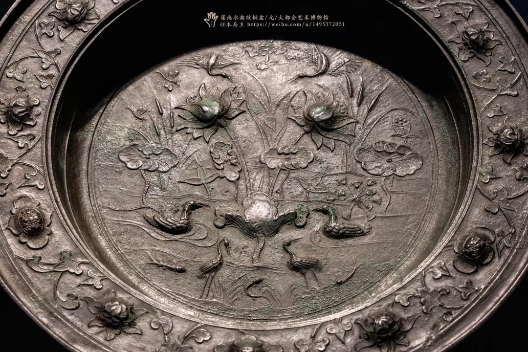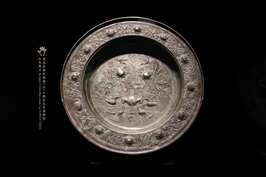 莲池水禽纹铜盆,元,大都会艺术博物馆,以及宜子孙双鱼铜洗,汉,上海博物馆