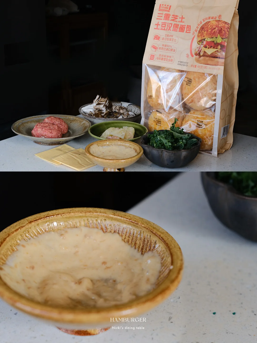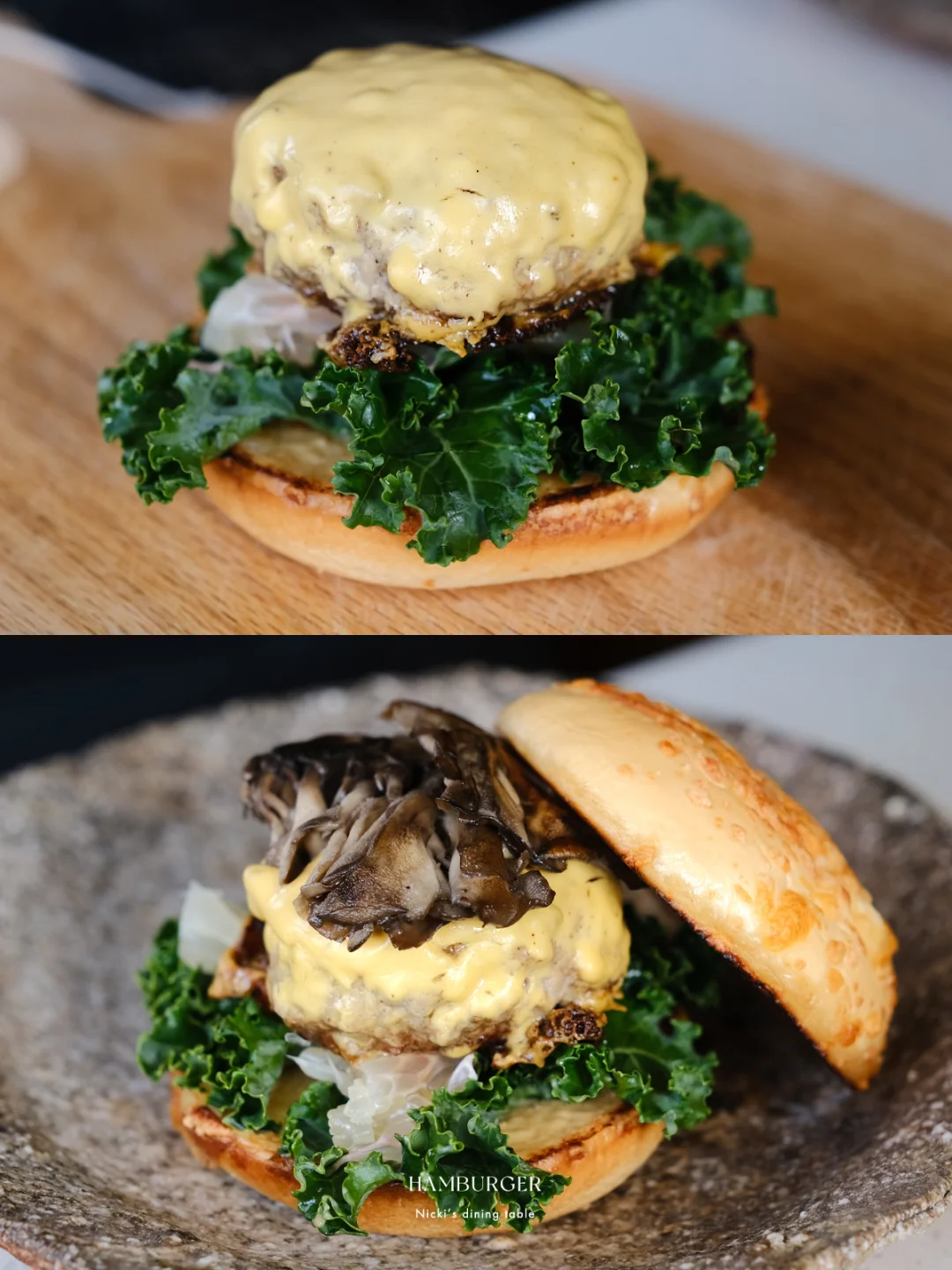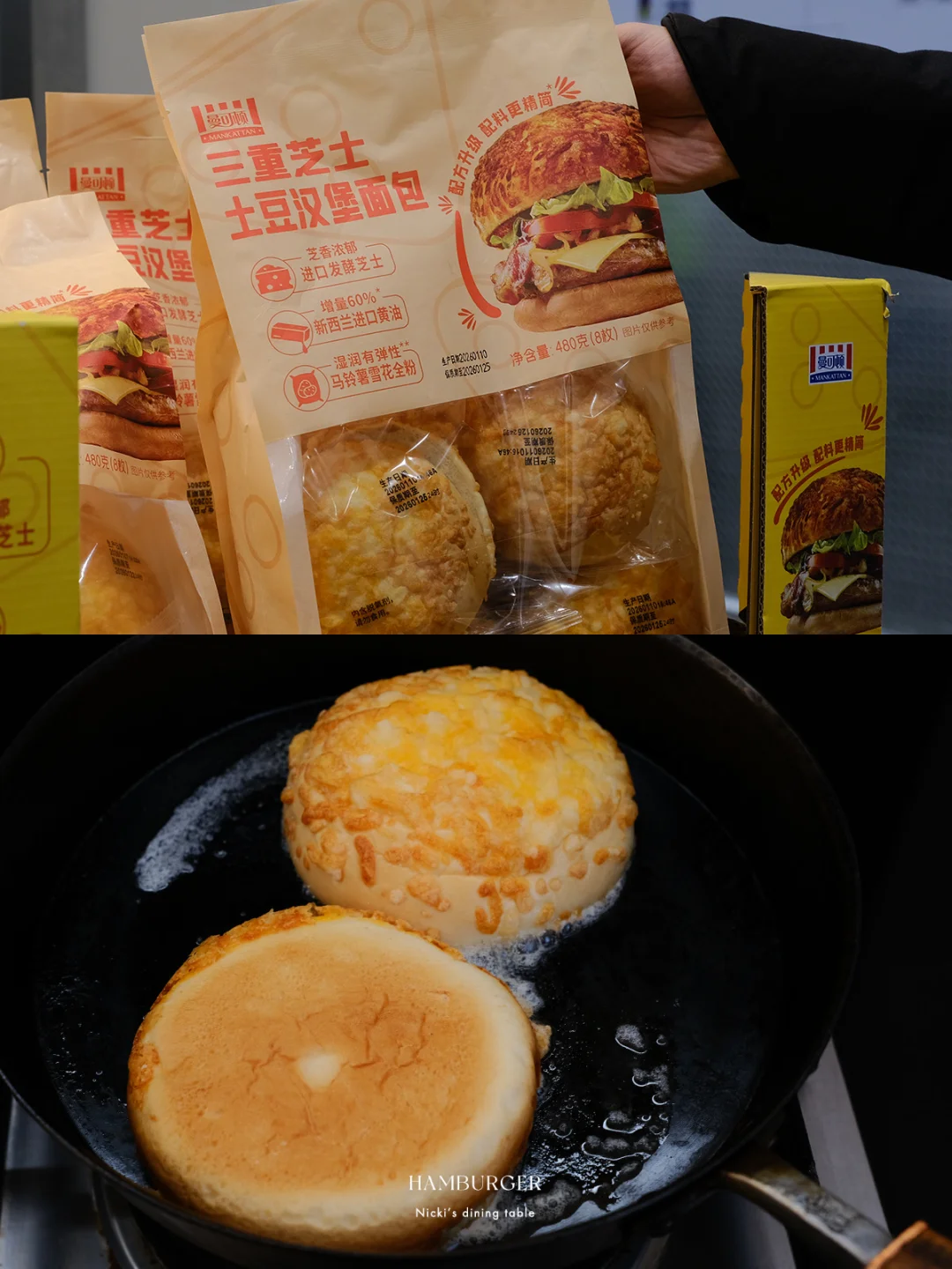 在汉堡节上看到了一款“柚见舞茸和牛堡”,太诱人!看了原版的制作视频,步骤还挺多,根据自己口味喜好稍稍做了一些减法。柚子+肉饼+舞茸,一口下去,汁水充盈。 🔅 做法: ·牛肉糜+猪肉糜(7:3)加面包糠、鸡蛋、胡椒盐,抓匀不断拍打上劲。 ·羽衣甘蓝无油下锅,撒上少许胡椒盐,炒香后盛出 ·锅中倒少许油,放入舞茸菇,用锅铲或者重物稍稍压一下,撒上少许胡椒盐盛出。 ·锅不用清洗,放入牛肉饼,煎至两面上色,淋少许水,盖上锅盖小火煎5-8分钟后,放上一片芝士,再盖盖焖2-3分钟。 ·另取一平底锅,锅中化开黄油,将汉堡面包煎上色 ·汉堡酱:味噌+蜂蜜+蛋黄酱 ·最后一步组装:面包抹上汉堡酱,依次铺上羽衣甘蓝、双色柚子、汉堡肉、舞茸菇即可。 - 汉堡的面包胚是逛山姆看到的新品:曼可顿三重芝士土豆汉堡面包。这款面包在三重芝士的加持下,比常见的汉堡胚口感更丰富,用黄油煎烤后,本身的芝士香以及乳香越发突出。面包体添加了马铃薯雪花全粉,吃起来不干巴且有弹性。