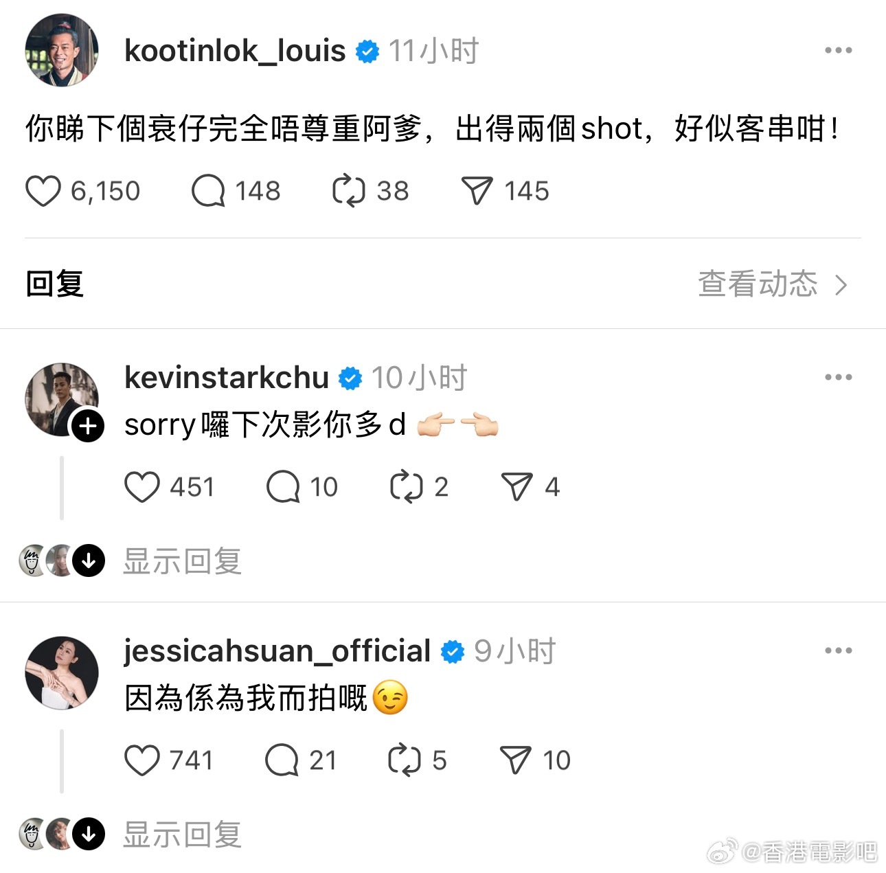 好热闹的一家三口“儿子”朱鉴然发了个视频,古天乐因为自己镜头太少吃醋了。古仔:你看看这个衰仔完全不尊重阿爹,就两个镜头,好像个客串。朱鉴然回:Sorry囖下次拍多点你👉🏻👈🏻宣萱出来护仔:因为是为我而拍的😉