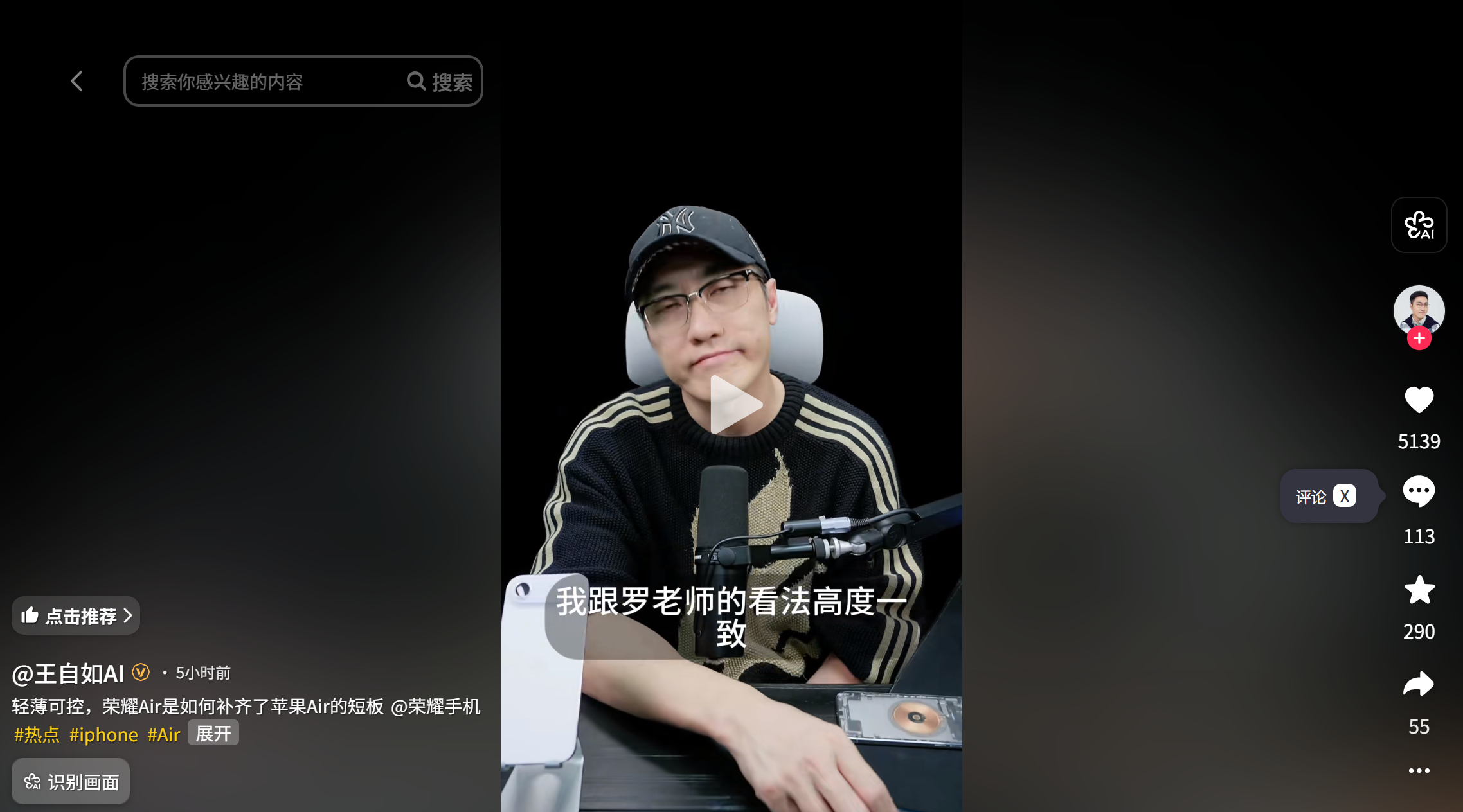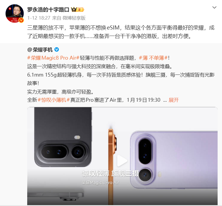 这两天,荣耀Magic8 Pro Air的声量很大。先是王自如和荣耀高管隔空battle,认为安卓做不好Air。后来老罗意外下场,认为这款新机的平衡性不错。在昨天的直播中,王自如说荣耀Air补齐iPhoneAir短板,态度来了个180度反转。查了一下,发现这款手机155g、6.1mm,轻薄上控制得不错,还带后置三摄、双扬和实体SIM卡槽,这在Air里还是很顶的。