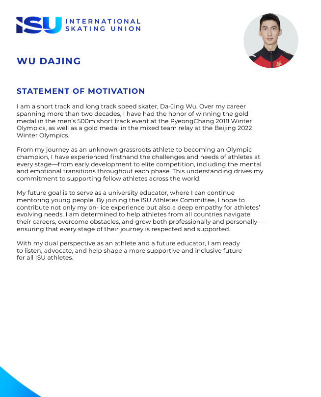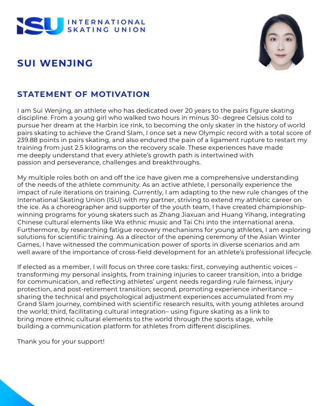 看到这个文件了,中国冰雪领军人物隋文静和武大靖要竞选国际滑联(ISU)运动员委员会委员了耶,彰显中国运动员在国际体坛参与度与话语权的双重提升。隋文静作为花样滑冰双人滑大满贯得主,曾以奥运纪录成绩摘金,职业生涯跨越伤病与挑战,如今更以编舞者、青年指导者等多重身份深入理解运动员发展需求。她承诺若当选,将聚焦规则公平、伤病防护与退役转型,推动文化融合与经验传承。武大靖在短道速滑男子500米项目实现奥运金牌突破,并助力混合接力夺冠。从基层走向巅峰的历程,使他格外关注运动员全周期成长与心理支持。未来志在投身教育的他,希望借助委员身份,协助各国选手规划职业生涯、突破发展困境。两位冠军的参选,不仅代表中国冰雪人的国际担当,也为全球滑冰运动员权益保障与体育文化交流注入新的动力。期待他们走向更广阔的国际体育治理舞台!