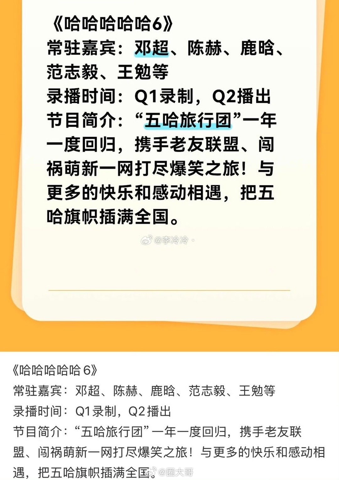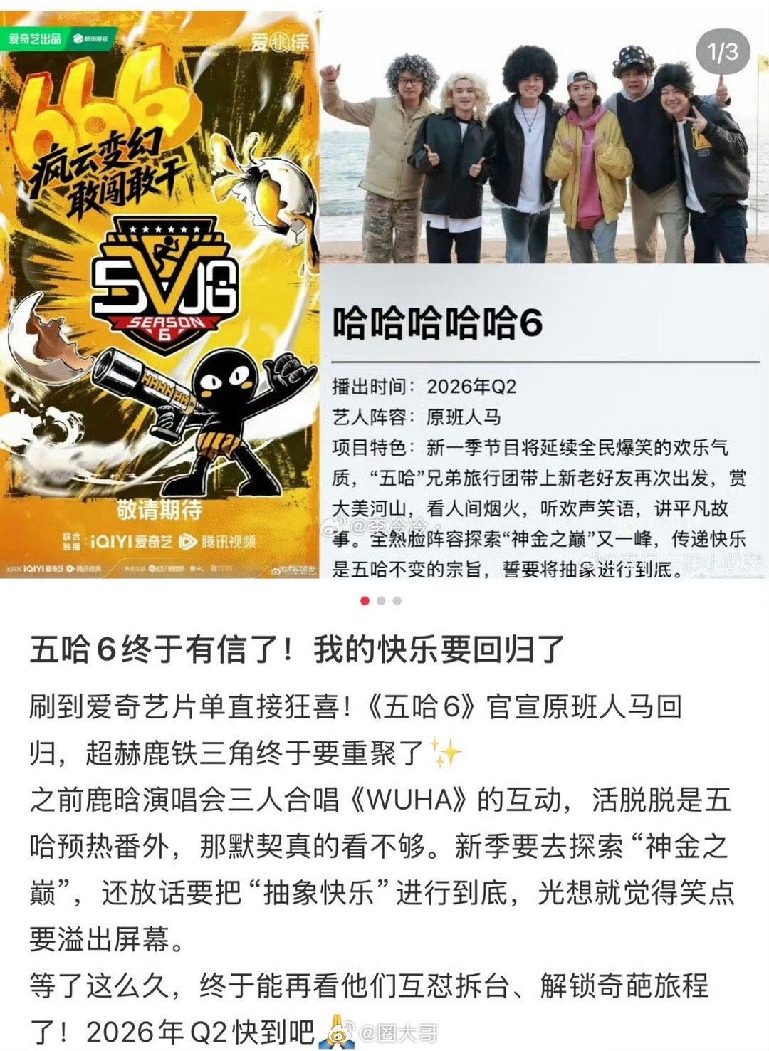 网传鹿晗回归录制五哈6哇哇哇哇快乐这不就回来了!鹿晗居然要回归录制《五哈6》了,新一季的嘉宾阵容:邓超、鹿晗、陈赫、范志毅、王勉。已经开始期待新一季的录制物料了~网传五哈6嘉宾阵容