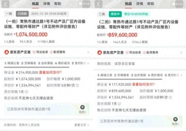 第一财经记者查询到,2025年12月30日,观致汽车常熟工厂进行了第一次拍卖,起拍价约10.75亿元,保证金约为2.15亿元,但遭到流拍。而观致汽车常熟工厂二拍起始价约8.6亿元,相较一拍起始价打了八折,保证金也下降至1.72亿元,加价幅度是100万,将于2026年1月15日10点开拍,竞价周期是1天。