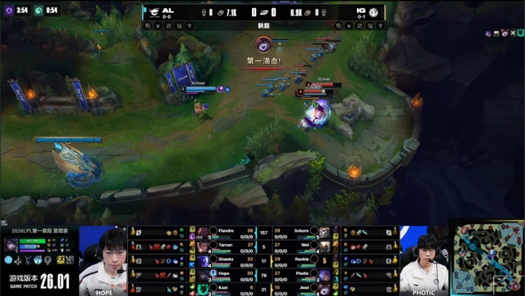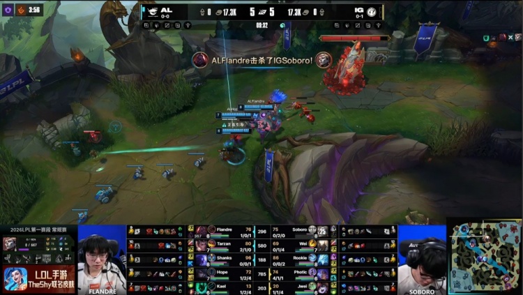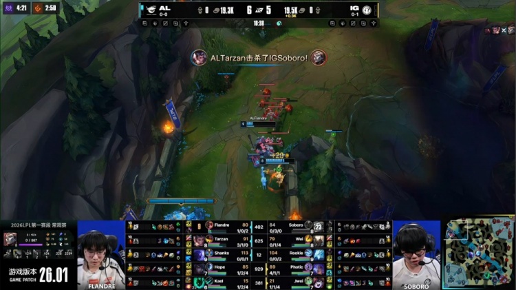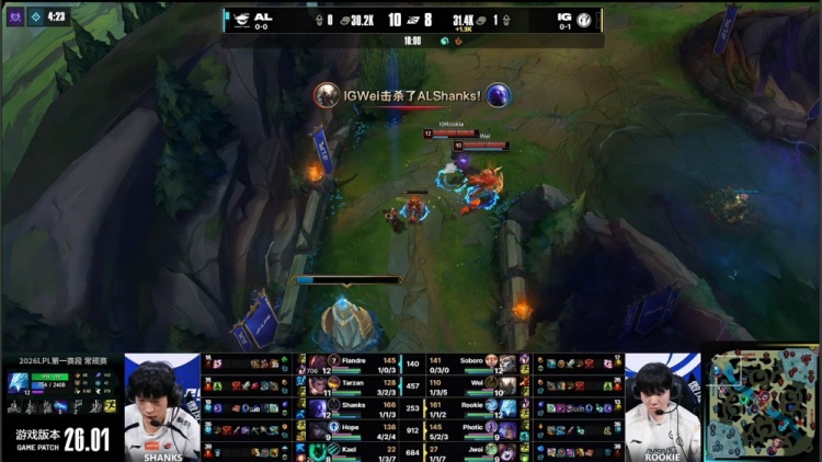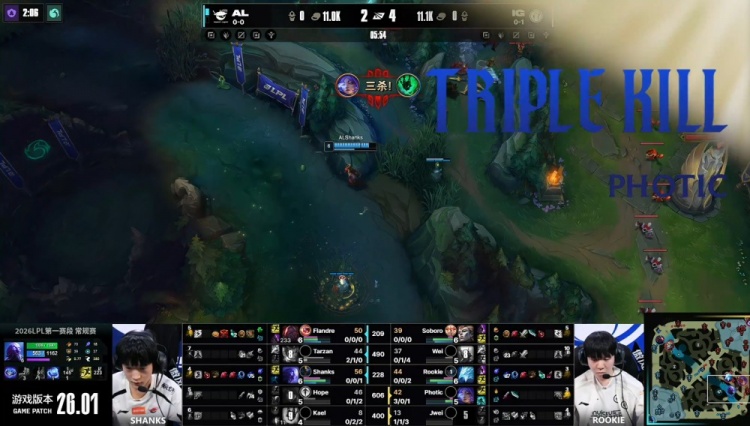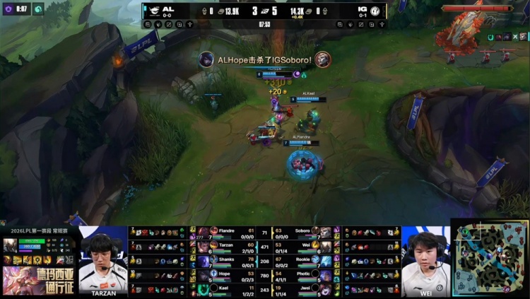 [13:12]Rookie冰鸟中路被Shanks瑞兹EW控住之后联手Tarzan赵信击杀,随后小龙团,AL正面四打三,Flandre赛恩TP来下,王杰厄斐琉斯击杀Wei潘森,Rookie冰鸟支援过来带走Tarzan,Photic芸阿娜点掉shanks瑞兹,iG打出2换3。