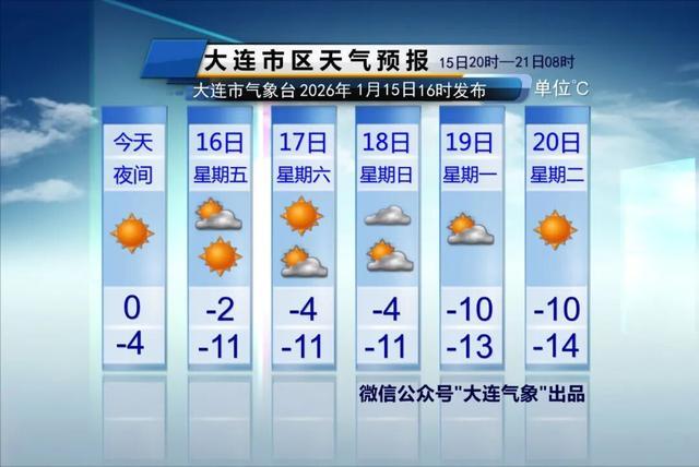 预计15日20时到17日8时,大连市中山区、西岗区、沙河口区、甘井子区、高新区各街道气温将明显下降,降温幅度8~10℃,17日早晨最低温度-11~-9℃。并伴有大风天气,16日5时至17日8时偏北风风力较大,大连近海及沿岸地区阵风最大可达8~9级,内陆阵风最大可达7~8级。请相关部门做好防寒潮准备工作。请广大市民注意防风保暖,对各类作物积极采取防冻措施。大连市气象台2026年01月15日14时35分发布。