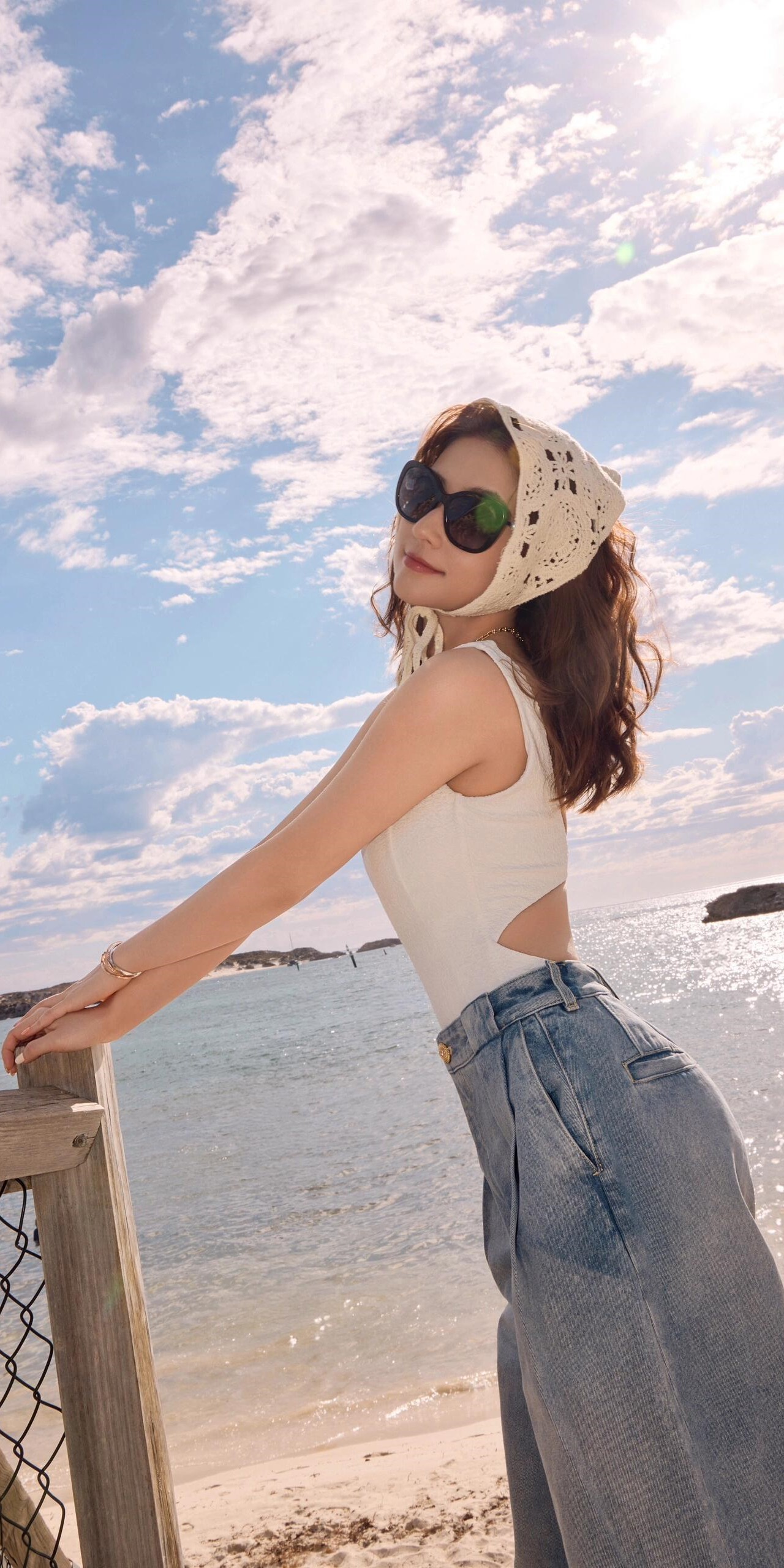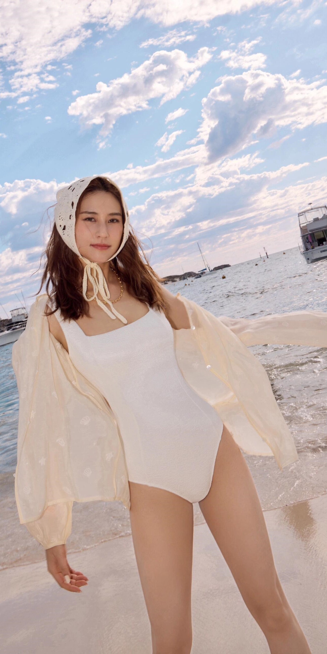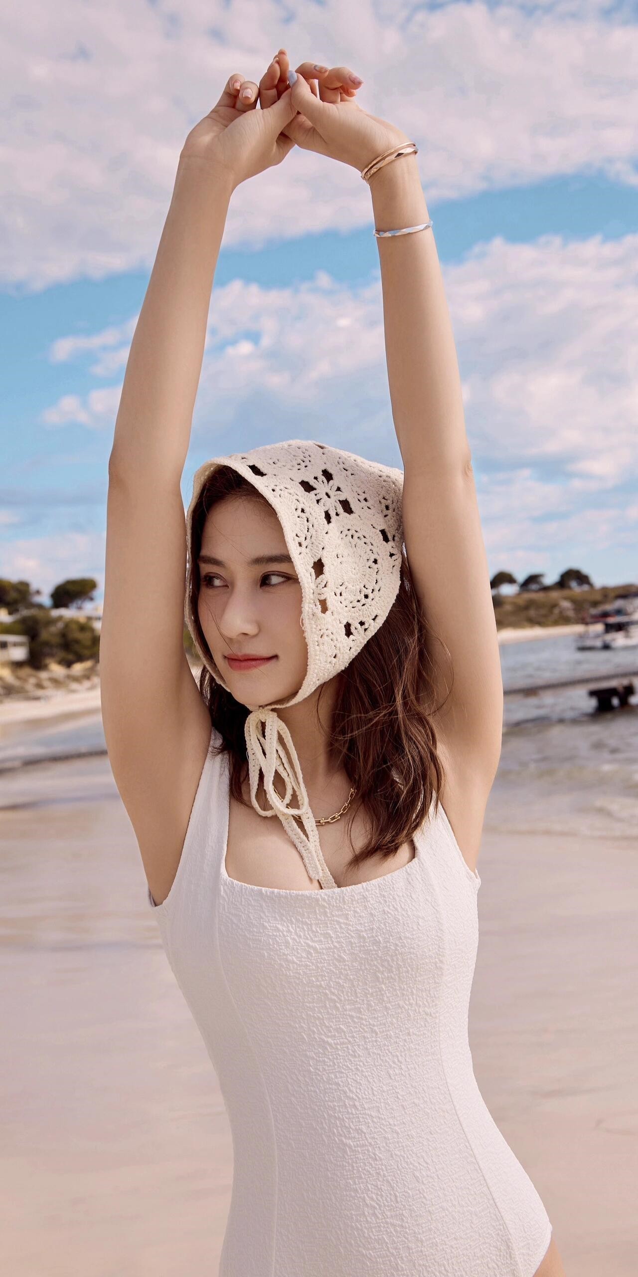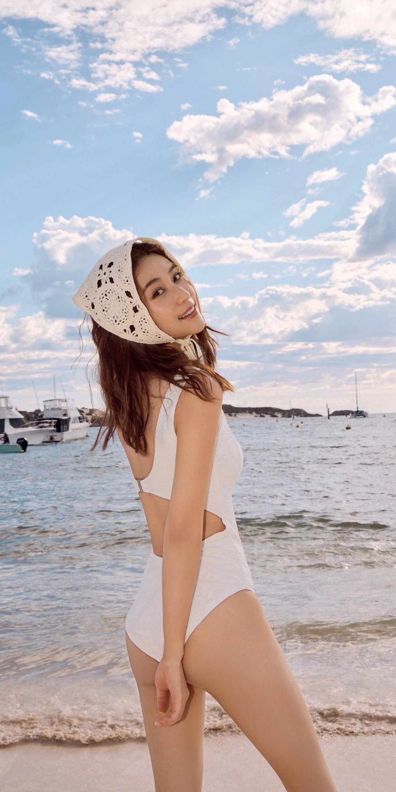 何超莲写真壁纸:白色泳装造型。何超莲