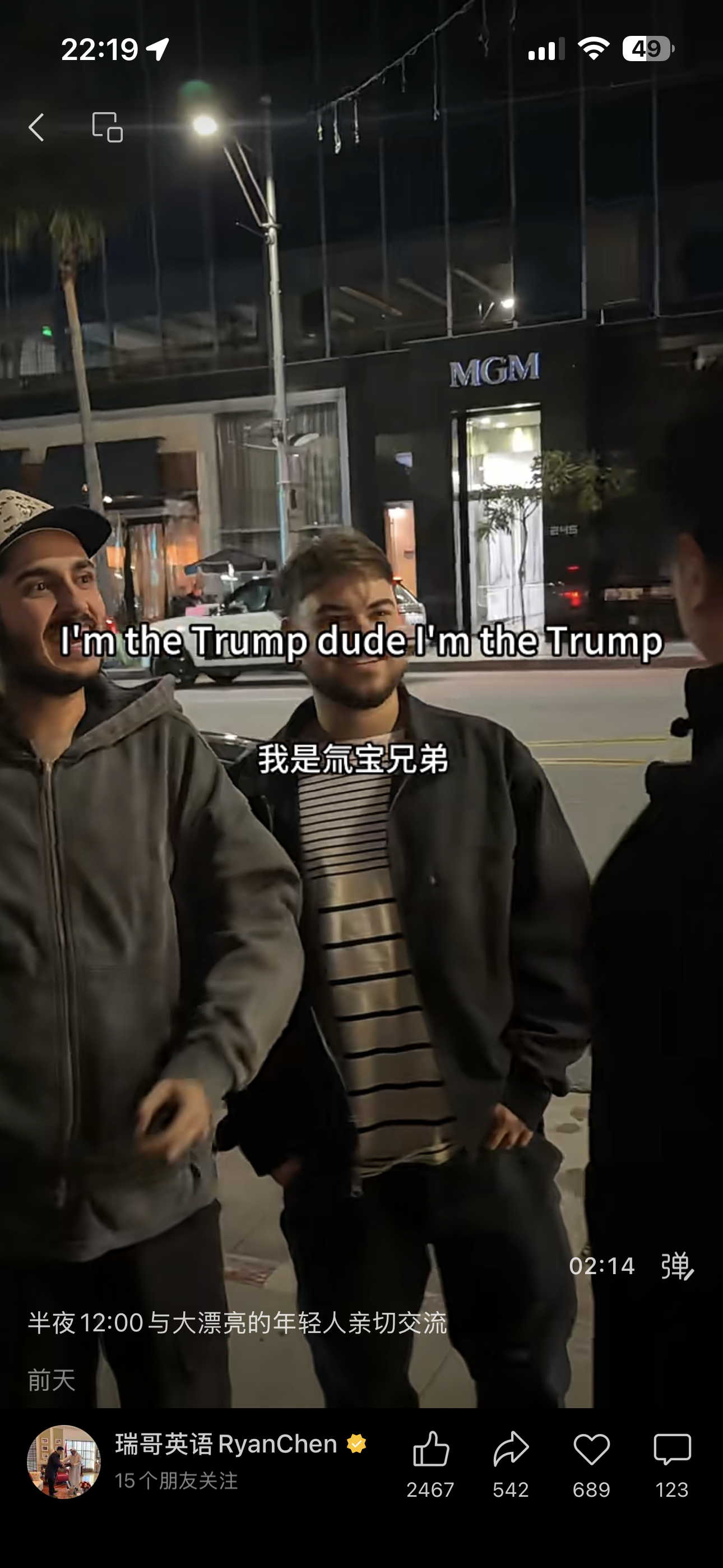 这个来自重庆的瑞哥~之前一直觉得他的才华在于模仿川普的讲话的那股神韵。但最近认真看了他的一些视频,特别是美国篇。你能看出来,这真的是个语言方面的“老艺术家”。表达能力和语言逻辑真的极强!能给老美逗的咯咯乐,还对世界各地的文化有不少了解,和好几个不同国家的老外,都能聊的畅快。甚至在聊天的过程中,还能自然的表达出咱们中国人的友善、乐观、和亲和力!然后,之前一直以为主要在国内火,没想到人在国外,也火的没边了,大街上随处都能碰到刷到过他视频的人找他合影。太强了!