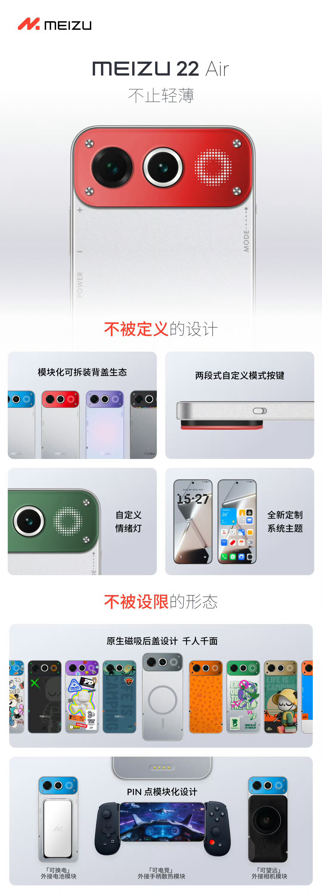 魅族 22 Air短暂的来了!有可拆卸外壳,自己定制热门ip后盖,模块化设计,看