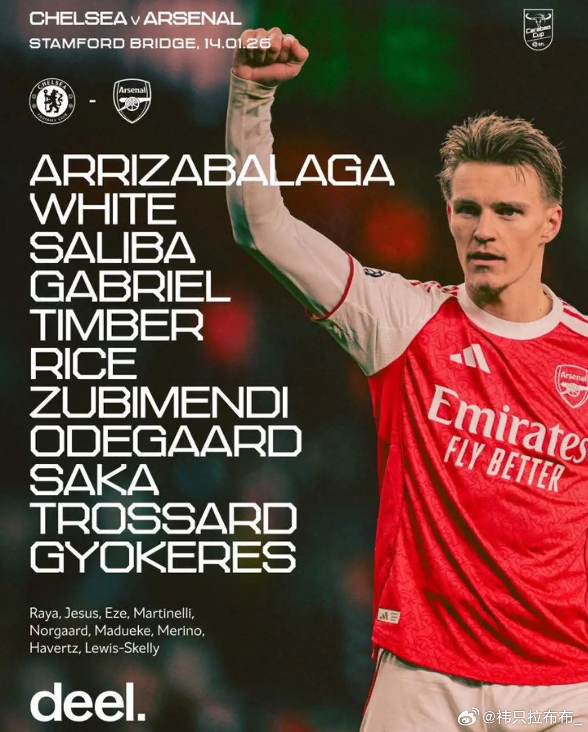 英联杯半决赛首回合,赛前双方公布首发:切尔西首发:1-罗伯特-桑切斯、34-乔希-阿昌庞、29-韦斯利-福法纳、23-特雷沃-查洛巴、3-库库雷利亚、17-安德雷-桑托斯、8-恩佐-费尔南德斯、41-埃斯特旺、7-佩德罗-内托、20-若昂-佩德罗、38-吉乌替补:4-阿达拉比奥尤、5-巴迪亚西勒、12-菲利普-约恩森、14-达里奥-埃苏戈、21-哈托、32-泰里克-乔治、40-法昆多-博纳诺特、49-加纳乔、62-姆厄卡阿森纳首发:13-凯帕、4-本-怀特、6-加布里埃尔、2-萨利巴、12-廷贝尔、41-赖斯、36-苏比门迪、8-厄德高、19-特罗萨德、7-萨卡、14-哲凯赖什替补:1-戴维-拉亚、9-热苏斯、10-埃泽、11-马丁内利、16-内尔高、20-马杜埃凯、23-梅里诺、29-哈弗茨、49-刘易斯-斯凯利