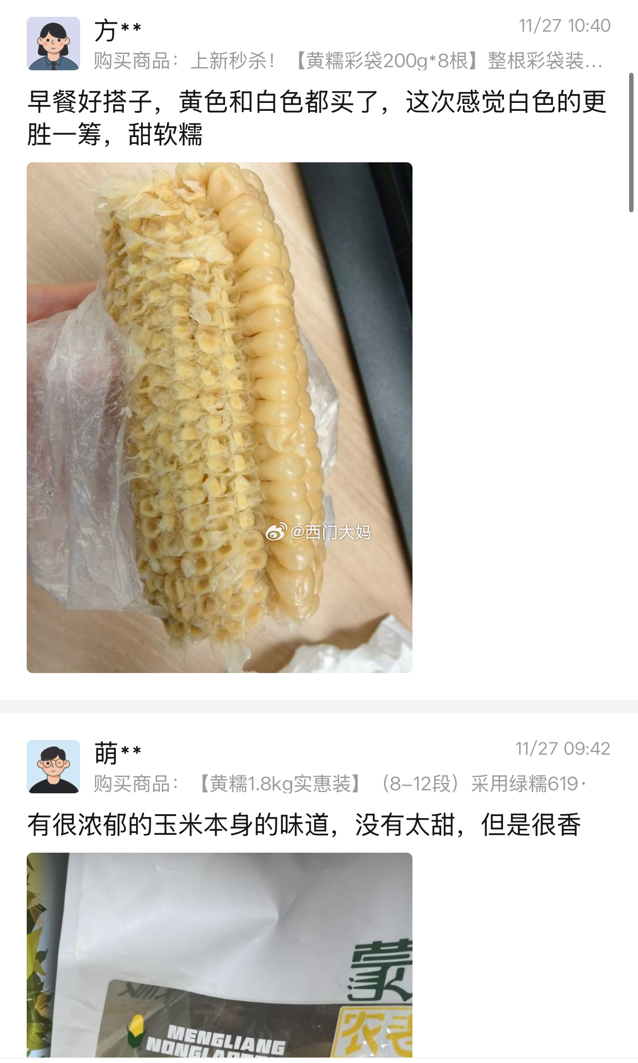 还有谁没吃过大妈的玉米吗?两种加起来卖了三四千单……吃了这个玉米,没有不回购的。最近发现了一个新吃法:无需蒸烤,微波炉直接打热即可。你会发现,所有的味道都紧紧的锁在包装袋内,极甜、极浓、极张。开微波炉门的那一瞬间,香爆了。这个好物闭眼入注意要去除彩色外袋。透明内袋也要撕开一个小口。我的习惯是微波炉3-4分钟左右。p.s.内袋是母婴级材料,可以直接微波炉。还有一个做法是,空气炸锅加黄油烤20分钟以上,出锅再磨一点黑胡椒盐。比高档西餐厅的玉米还好吃。毕竟他们用的玉米可没这么好。品种还是,白糯【农科糯336】、黄糯【绿糯619】,产地还是敖汉,这里有被联合国粮农组织列为全球重要农业文化遗产的敖汉旱作农业系统,光照时间长、昼夜温差大,一年只产一季,生产时间更长,风味物质积累的也更充分。 2025新货!3粒糯1粒脆