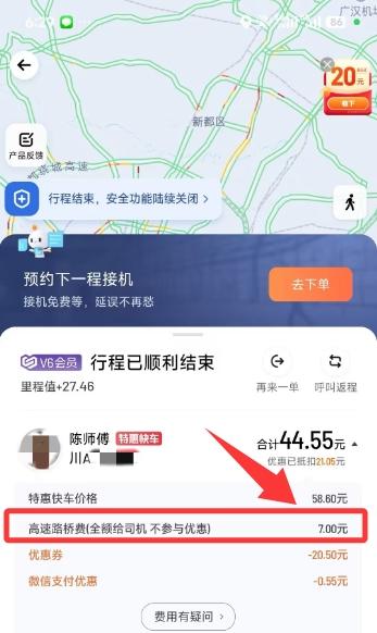 张先生表示,近日,他在龙泉驿区通过滴滴平台呼叫网约车,乘车从绕城高速成龙收费站上成都绕城高速公路,去往成都双流国际机场。到达目的地后,张先生因着急赶飞机,未检查费用直接下车,由手机订单自动支付费用。过后,他查看才发现多了一笔7元的“高速路桥费”。