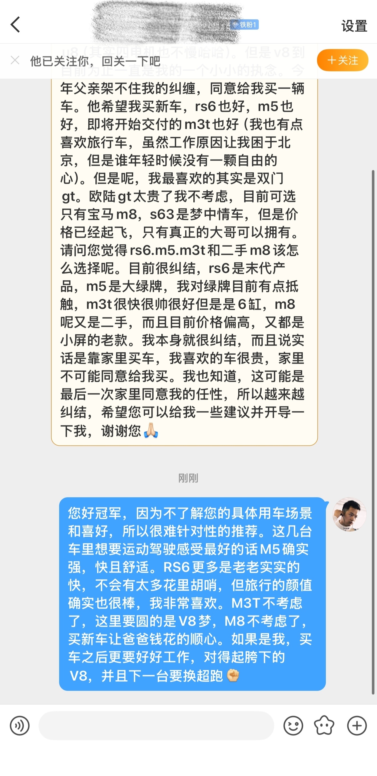 关于U8换V8的一些建议您好冠军,因为不了解您的具体用车场景和喜好,所以很难针对性的推荐。这几台车里想要运动驾驶感受最好的话M5确实强,快且舒适。RS6更多是老老实实的快,不会有太多花里胡哨,但旅行的颜值确实也很棒,我非常喜欢。M3T不考虑了,这里要圆的是V8梦,M8不考虑了,买新让爸爸钱花的顺心。如果是我,买车之后更要好好工作,对得起胯下的V8,并且下一台要换超跑欣哲频道冠军问答奥迪rs6