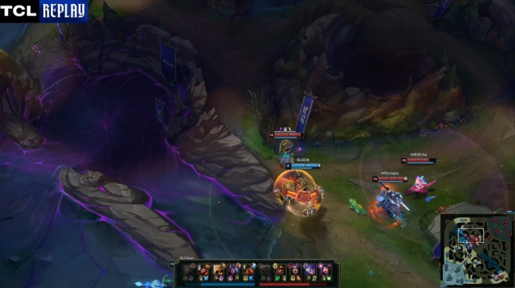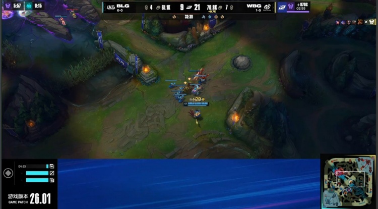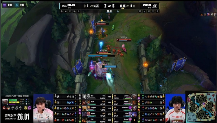 [12:49]河道团战,双方辅助互换,Xun猴子拿到Erha妮蔻终结人头。随后阿Bin上路亚恒追击Zika安蓓萨进塔,后者配合防御塔打出阿Bin亚恒被动复活,Xun猴子绕后也没能逮捕Zika,BLG三人回头推掉WBG上路一塔。
