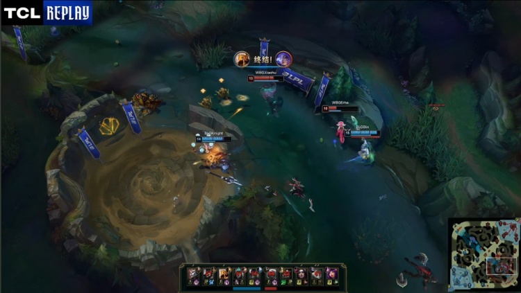 [7:13]下路3v3,ON泰坦配合队友越塔强杀Elk芸阿娜与之互换,Viper韦鲁斯抗塔致死被杀,Xiaohu妖姬来下支援拿到双杀,WBG打出0换3。