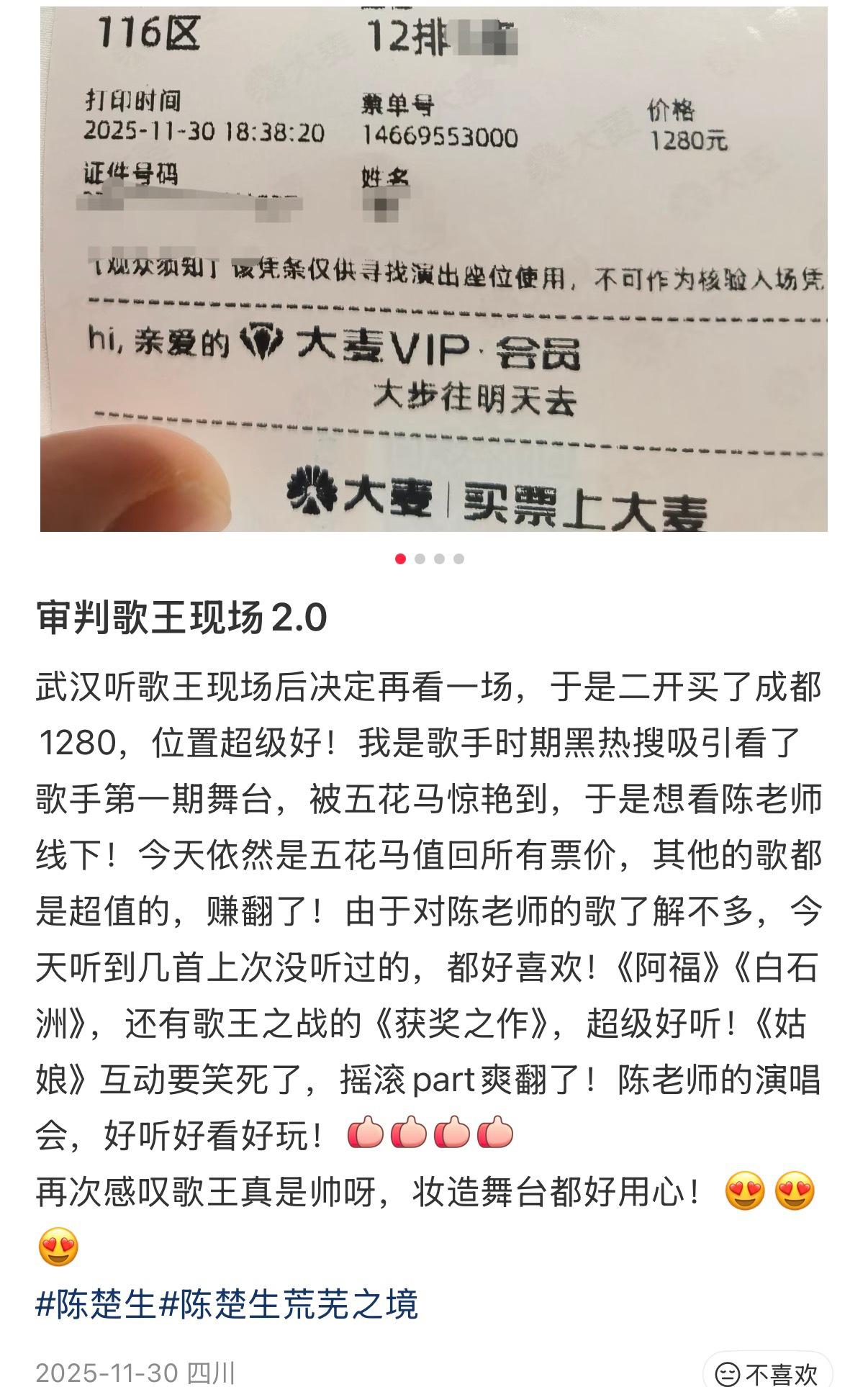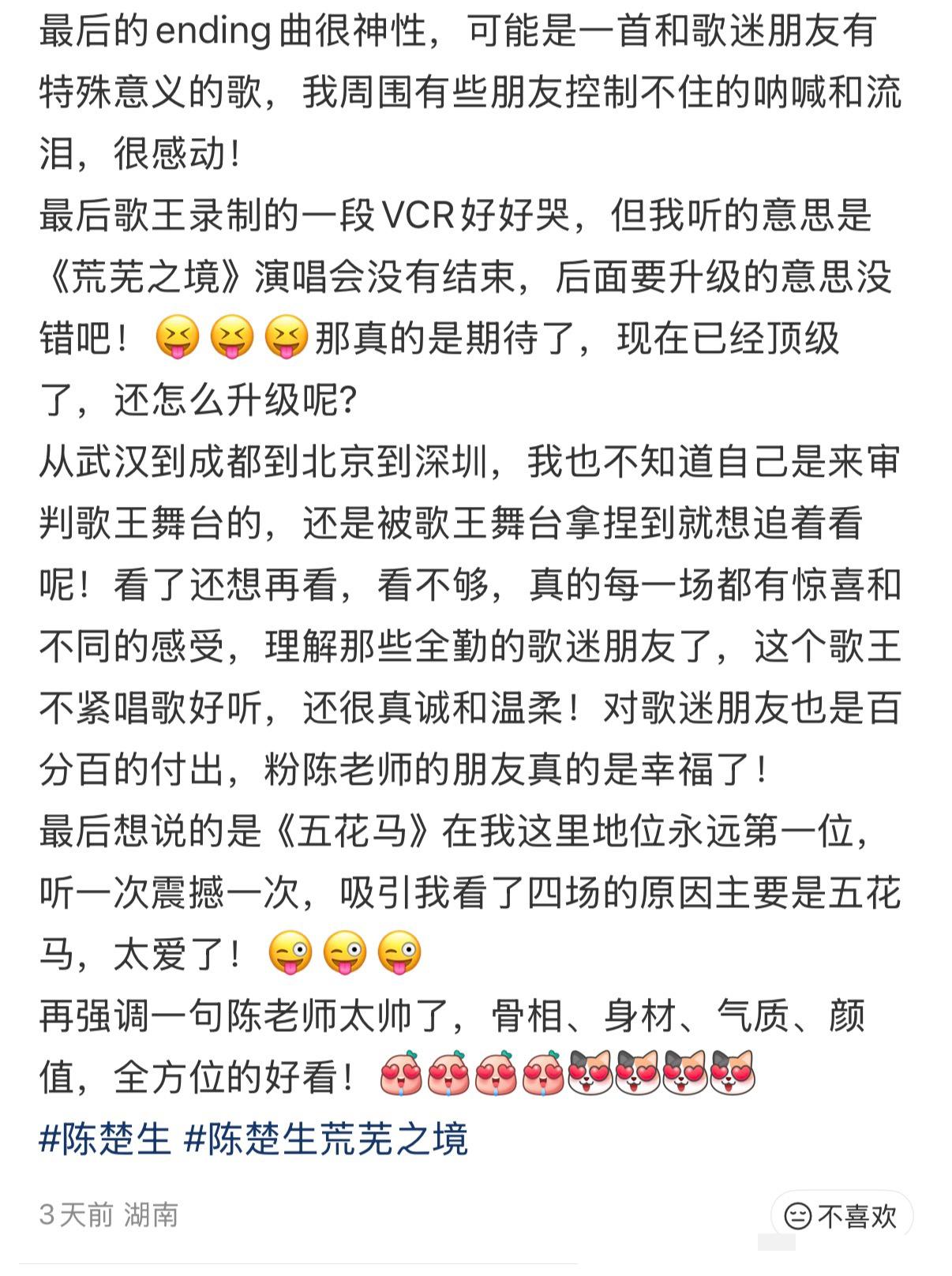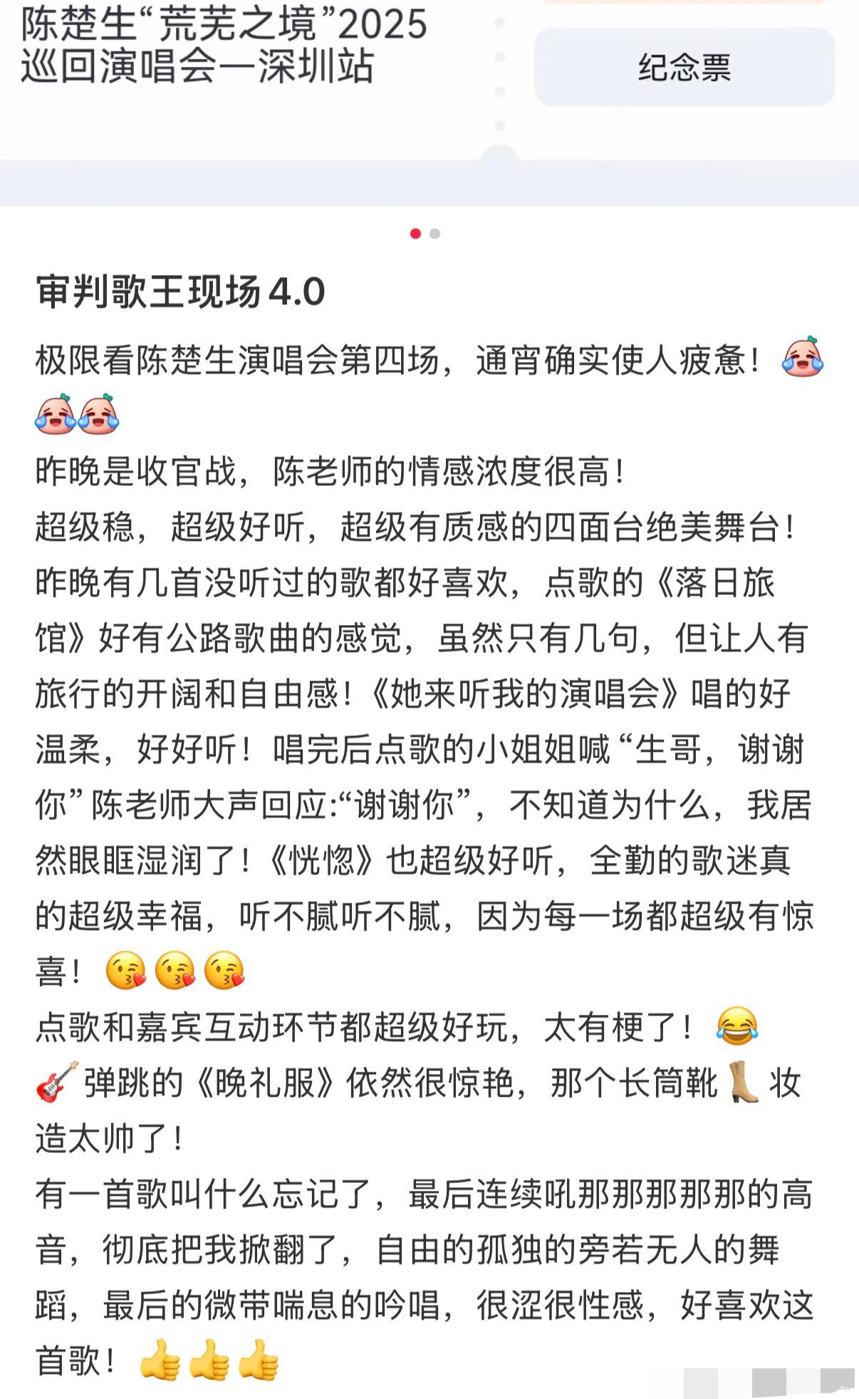 一位本来抱着看乐子心态审判歌王的路人,被五花马带飞竟然连刷4场荒芜之境。 哈哈哈🤣这就是歌王的实力。 他本来就是因为歌手期间黑粉对楚生的评论,准备抱着审判的态度去现场听楚生唱歌🎵。 结果听了一场觉得很好听,于是又来了第二、第三和第四场,repo字数也是越写越长。 本来是想审判歌王的,后来却被拿捏。 我相信很多人都是这样入坑的。