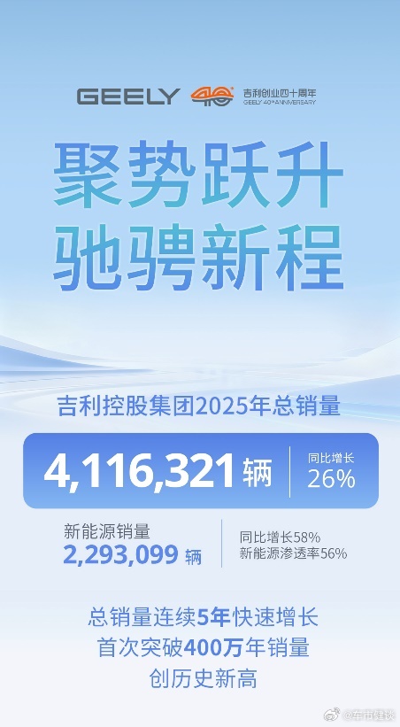 【从吉利汽车到吉利控股 连续五年快速增长!2025年总销量411.6万辆】2025年,吉利控股集团全球总销量4,116,321辆,同比增长26%,实现连续五年快速增长,年销首次突破400万大关,创历史新高。 其中新能源销量2,293,099辆,同比增长58%,新能源渗透率56%,成为集团市场增长的主要驱动力,在全球车企中处于领先地位。 吉利汽车控股有限公司(简称“吉利汽车”)2025年总销量3,024,567辆,超额完成年中上调后的300万辆年度销量目标,同比增长39%,创历史新高。 其中吉利银河品牌全年销量124万辆,同比增长150%,超额完成“百万银河”销量目标;领克品牌全年销量35万辆,同比增长23%,创历史新高;极氪品牌全年销量22.4万辆,12月单月交付突破3万辆,极氪9X成为50万元以上大型SUV销冠。 吉利汽车在燃油领域始终占据行业领先地位,吉利中国星年销量121万辆,连续3年销量超百万,同比增长3%。 吉利控股旗下的沃尔沃汽车2025年总销量710,042辆,其中新能源销量达323,294辆,新能源渗透率达46%。 宝腾汽车2025年总销量162,601辆,逆势同比增长6.5%。 极星2025年总销量超6万辆,同比增长超30%。 莲花跑车在2025年开启了以中国市场为核心的新发展阶段,ELETRE与EMEYA两款核心车型焕新上市并优化定位,其中ELETRE在中国市场实现30%的销量增长,助力品牌进一步稳固在超豪华细分市场的地位。 远程新能源商用车集团2025年度销量162,019台,继续领跑行业。实现连续4年销量排名行业第一,累计销量突破50万辆。吉利控股集团吉利控股集团2025年销量超411万辆 哈尔滨·炫彩冰上运动中心(南门)